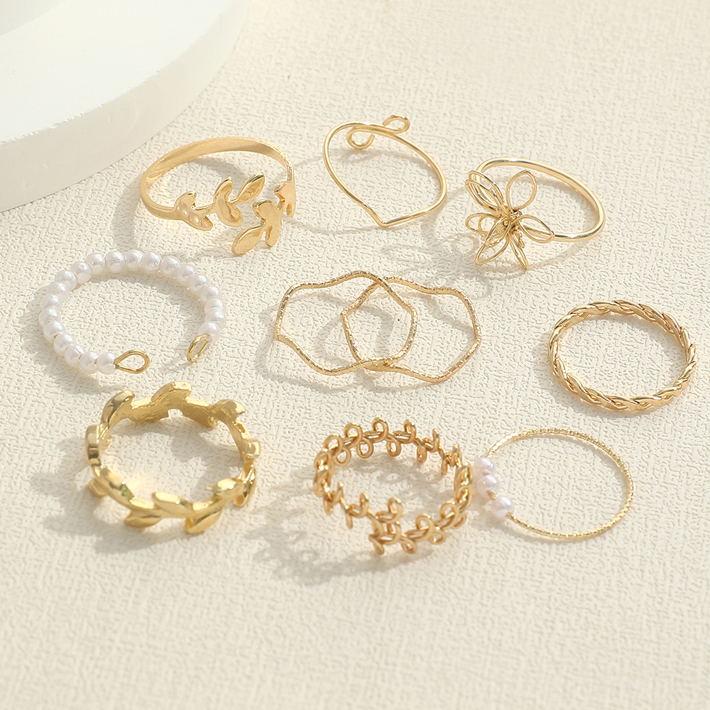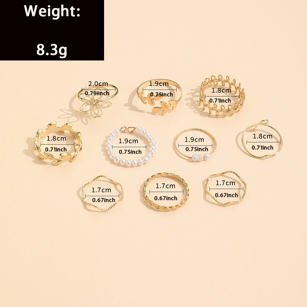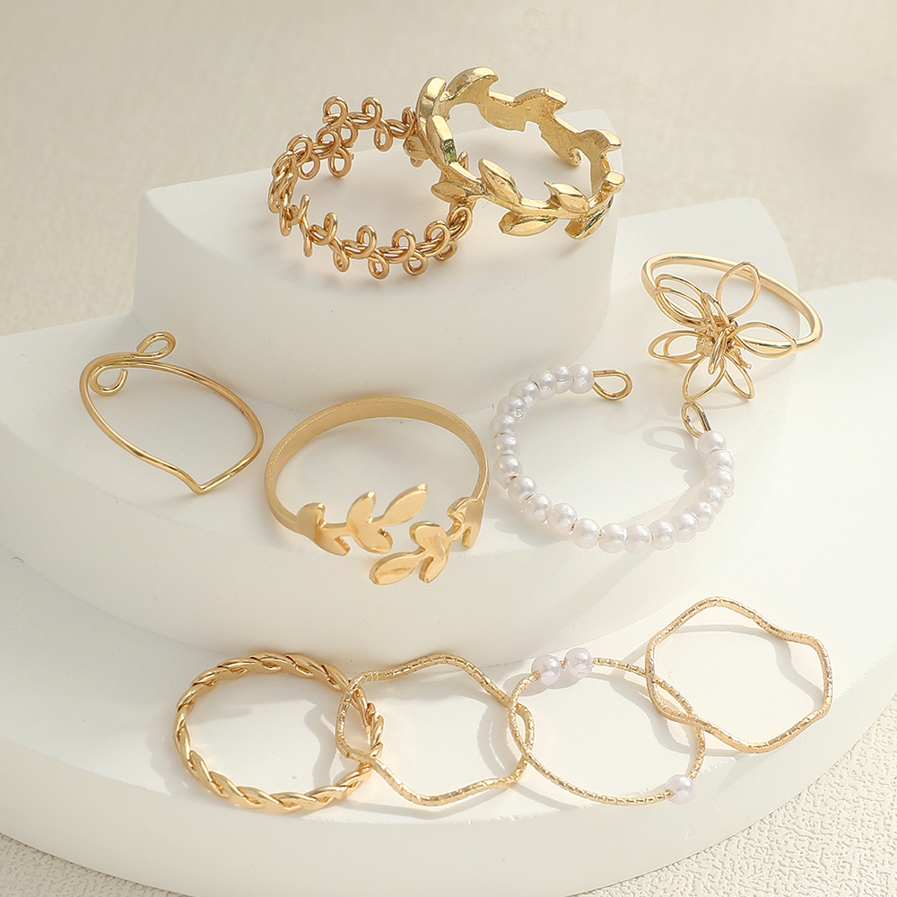 Conjunto de 10 Anéis de Flores Ocados Fashion, Anéis Minimalistas com Pérola e Folha para Mulheres
