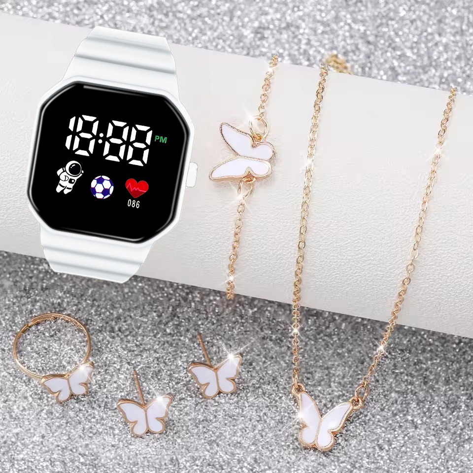 Conjunto de 6 relógios digitais LED para mulheres com pulseira de silicone e enfeite de borboleta, elegante para uso
