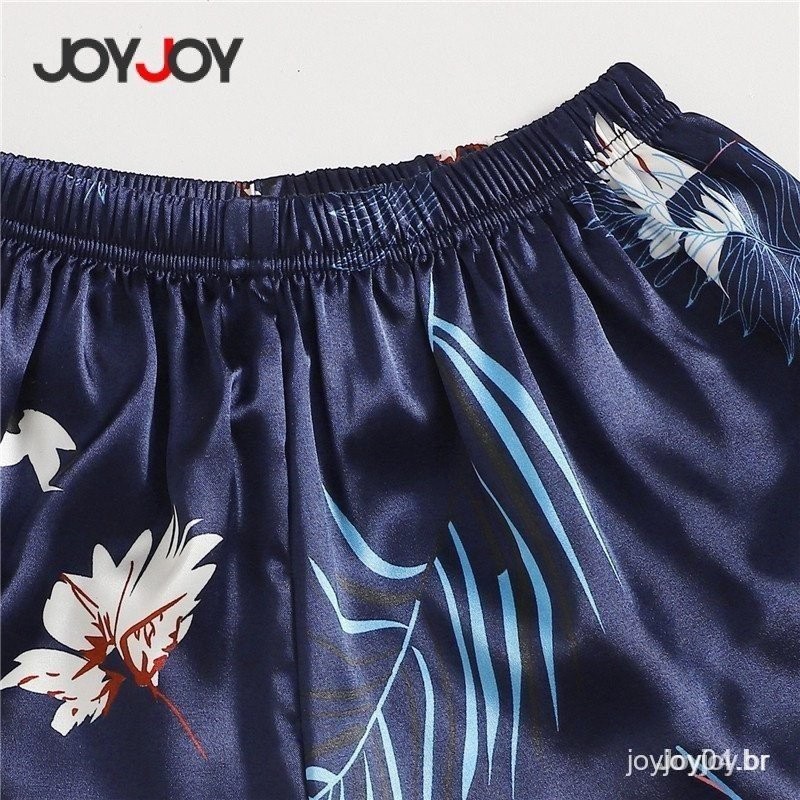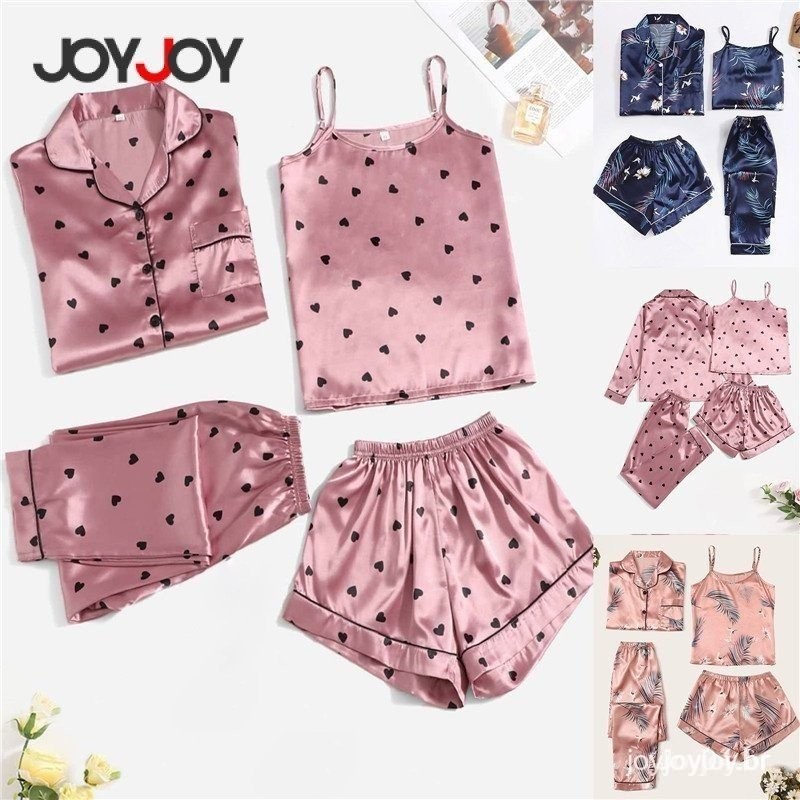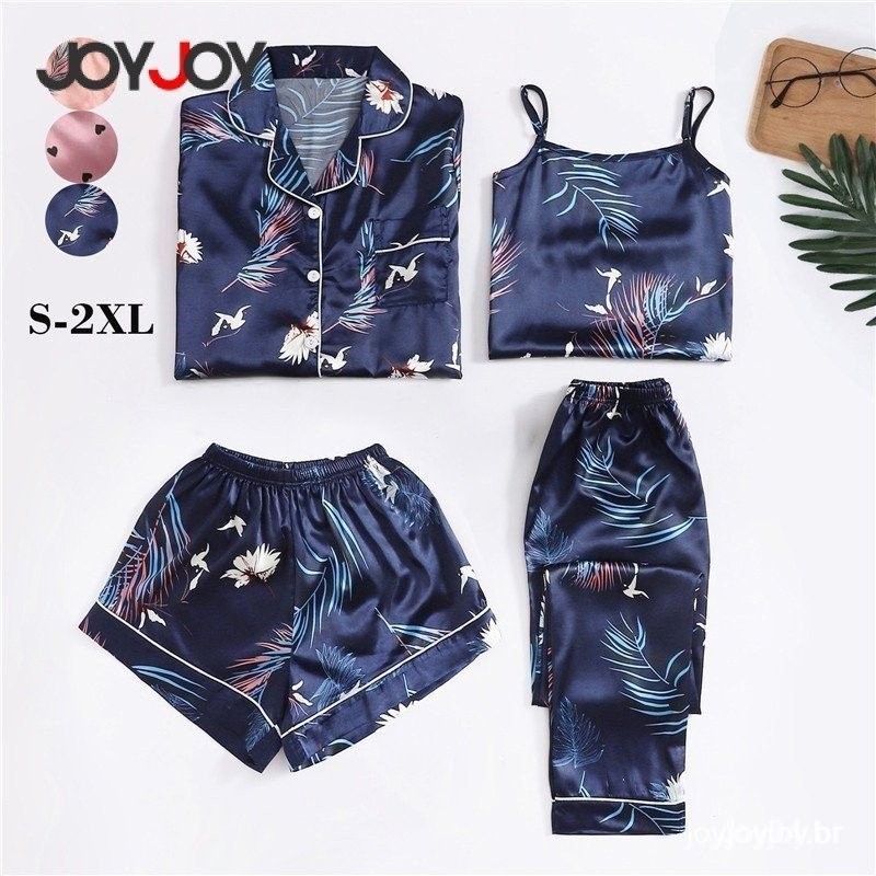 Conjunto de Pijama de Seda Feminino 4 Peças – Roupa de Dormir Sexy com Camisa de Manga Longa, Shorts, Calça e Camiseta