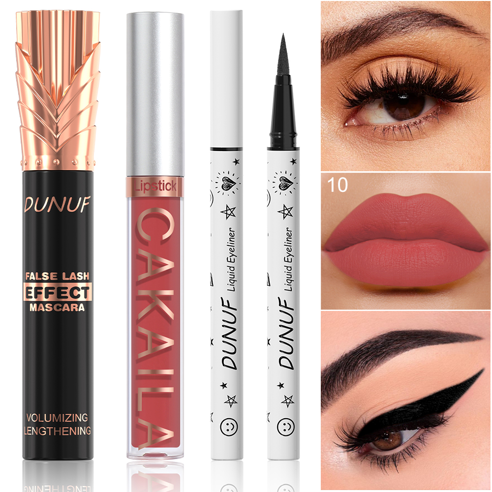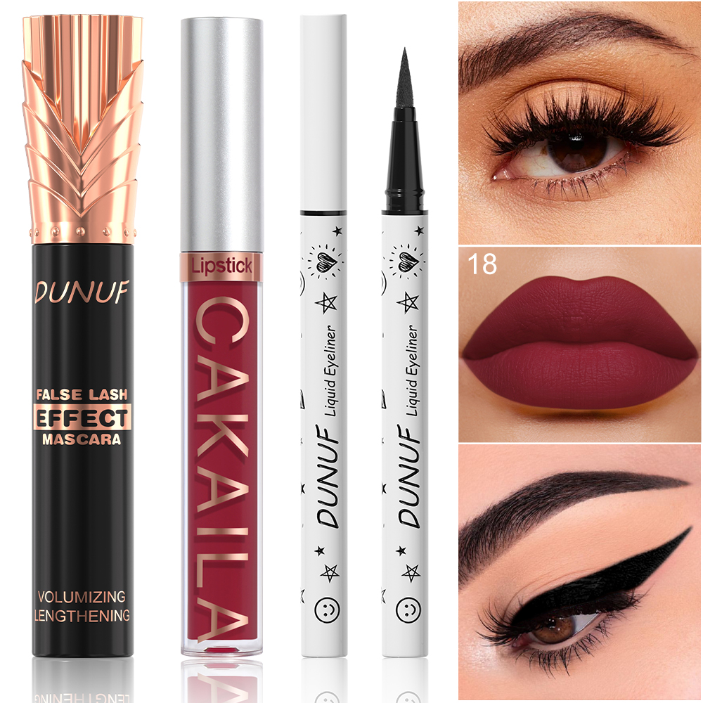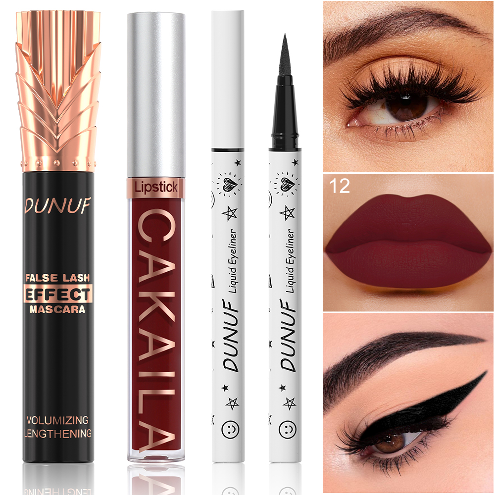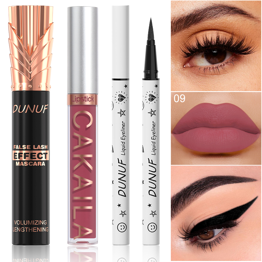 Conjunto de maquiagem, 1 batom fosco, 1 gloss labial, 1 máscara preta, 1 delineador fácil de colorir.