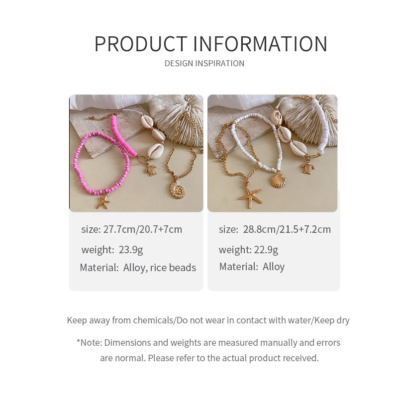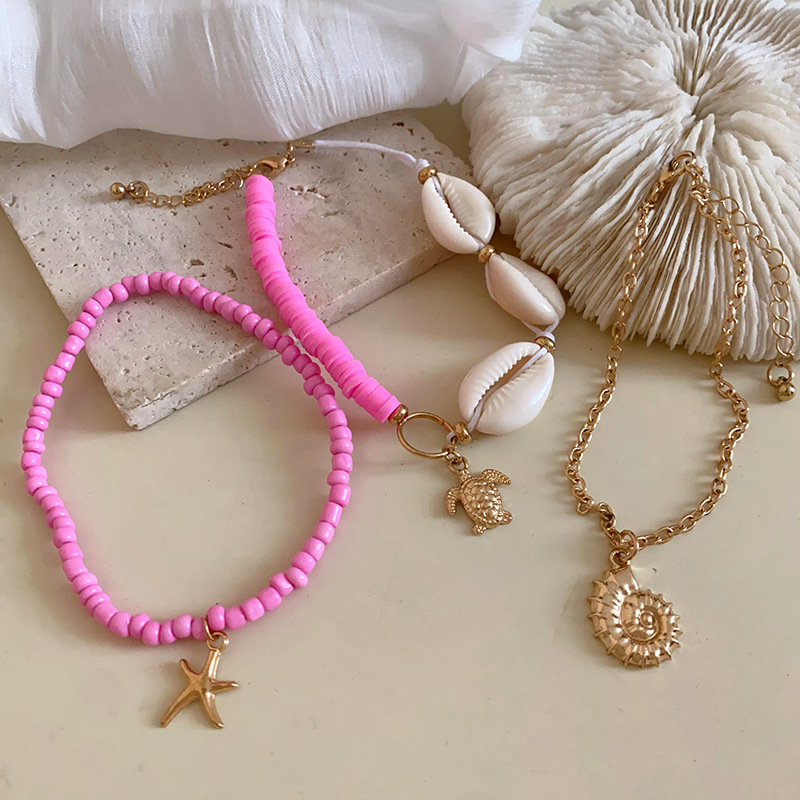 Conjunto de pulseira e tornozeleira feminina com contas de arroz imitando conchas estilo étnico, boêmio, retrô, anel de