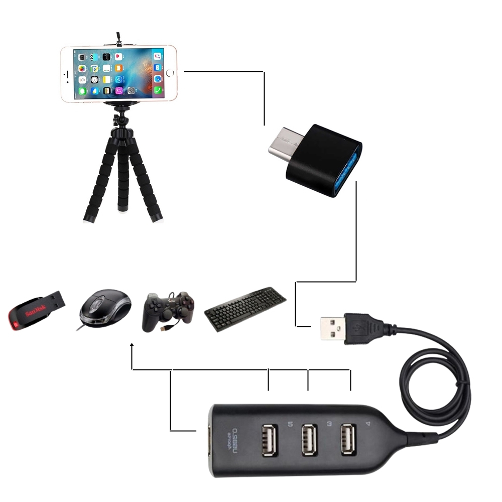 Conversor Celular Gamer Hub Usb 4 Portas + Adaptador Otg C + Suporte Tripé Kit Mobilador Pronto Pro Jogo