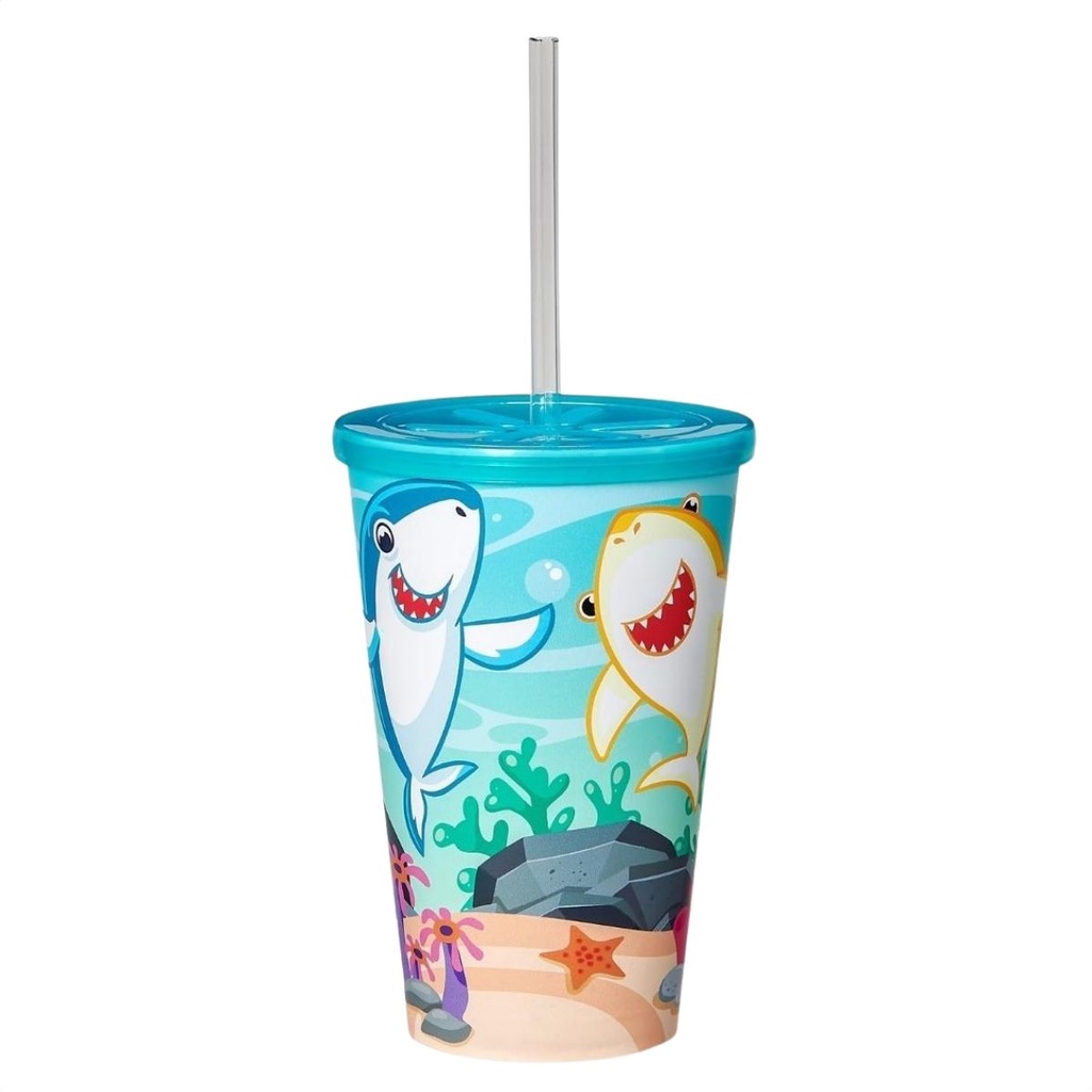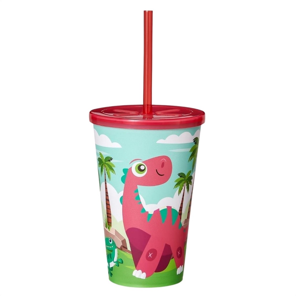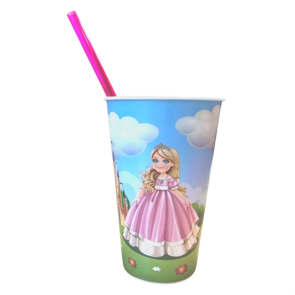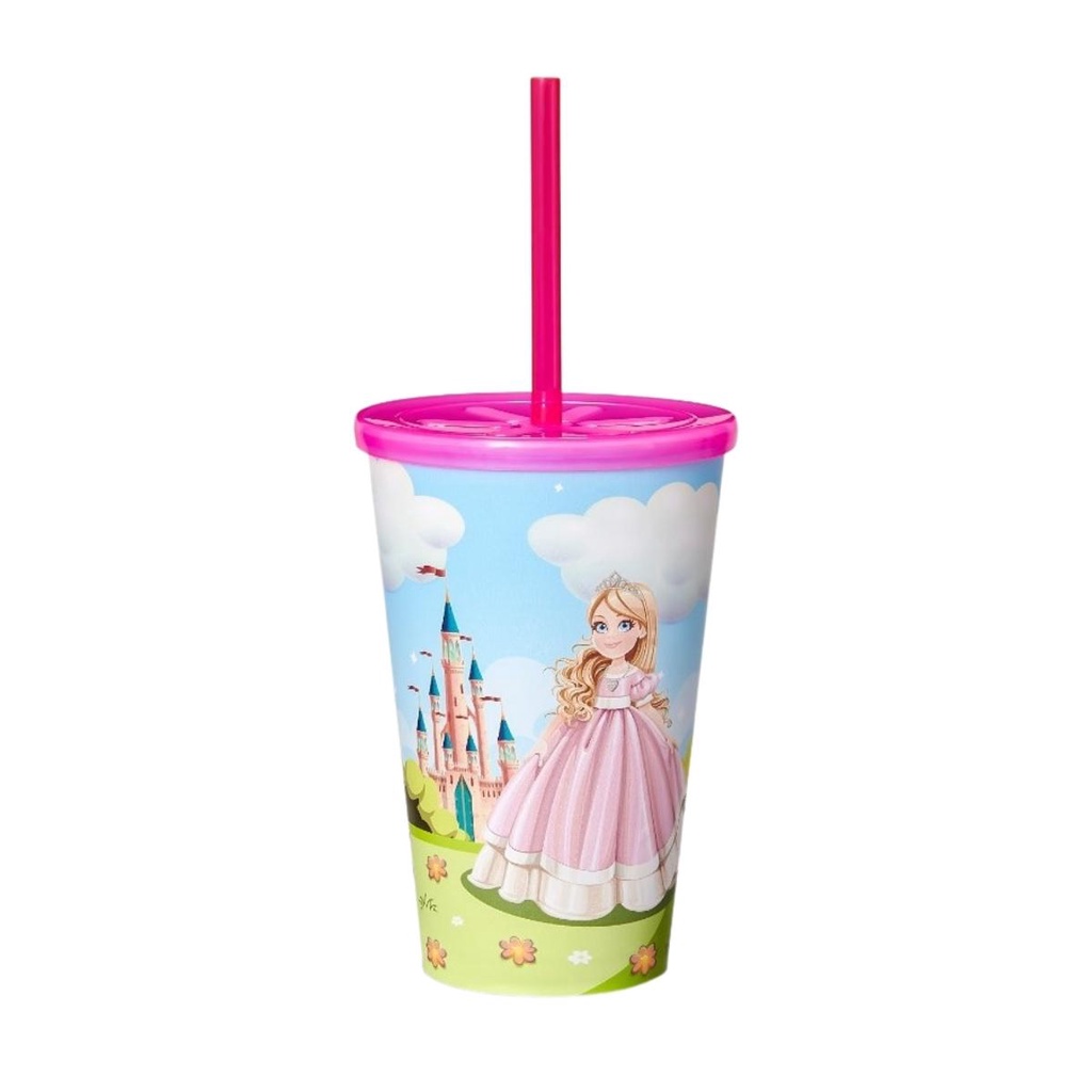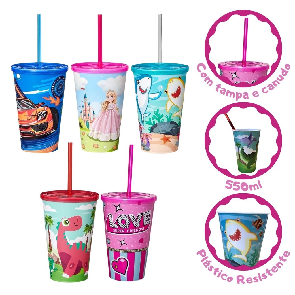 Copo Infantil 550ml Decorado Tampa Reta E Canudo Resistente Para Crianças Usual