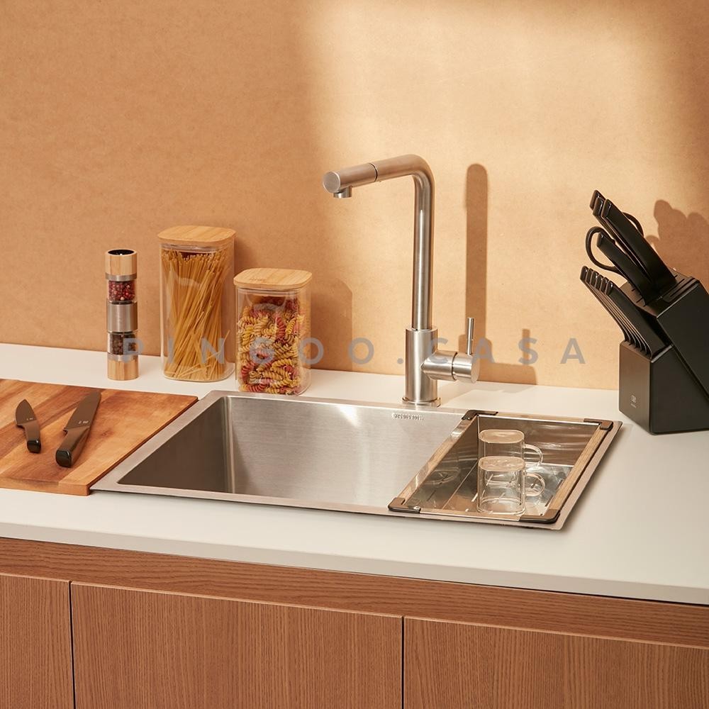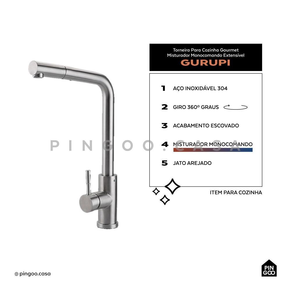 Cuba para Cozinha Terena 58 cm e Torneira Misturador Monocomando Extensível Gurupi Pingoo - Prata