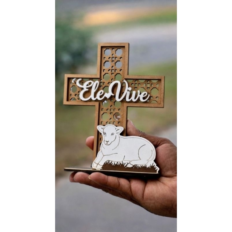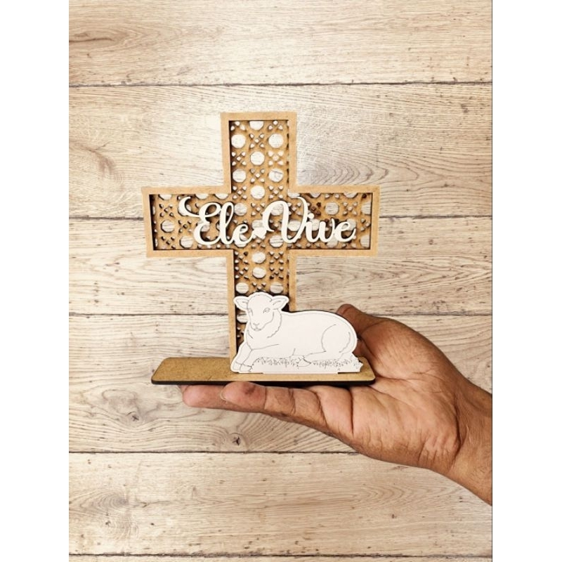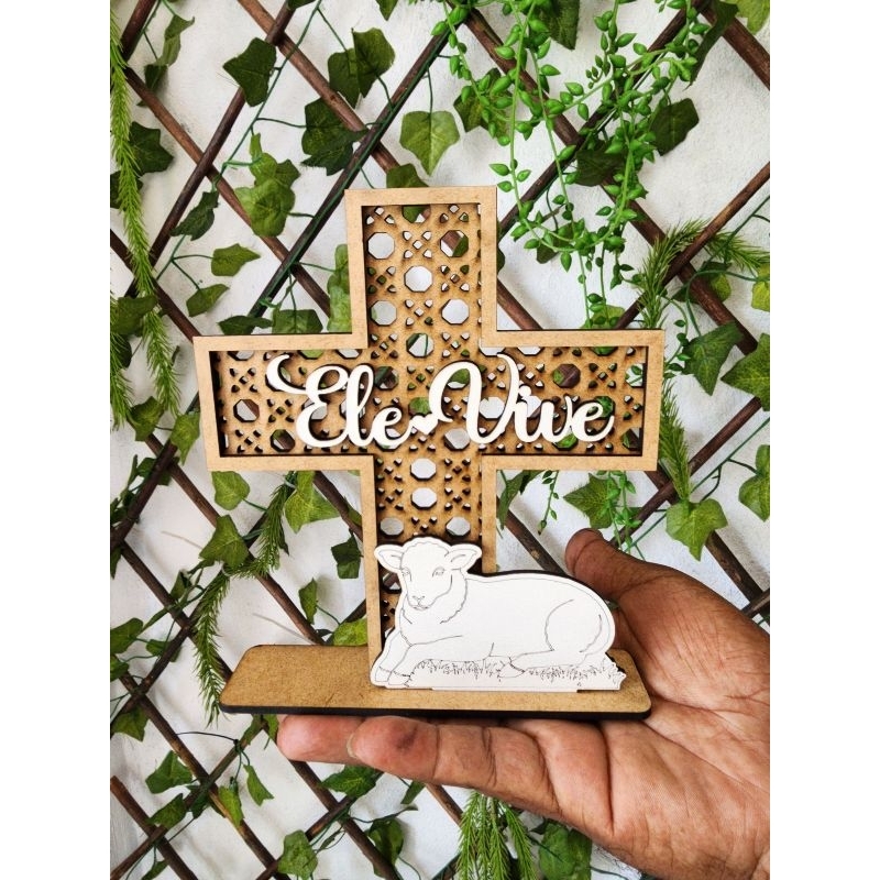 Enfeite Páscoa /Palha Cruz Ele Vive Cordeiro 15 cm MDF