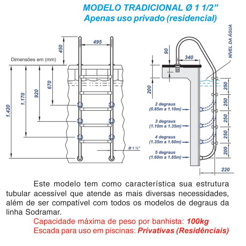 Escada para Piscina 1.1/2 POL em Aço Inox com 3 Degraus Anatômicos em ABS SODRAMAR