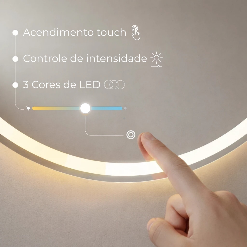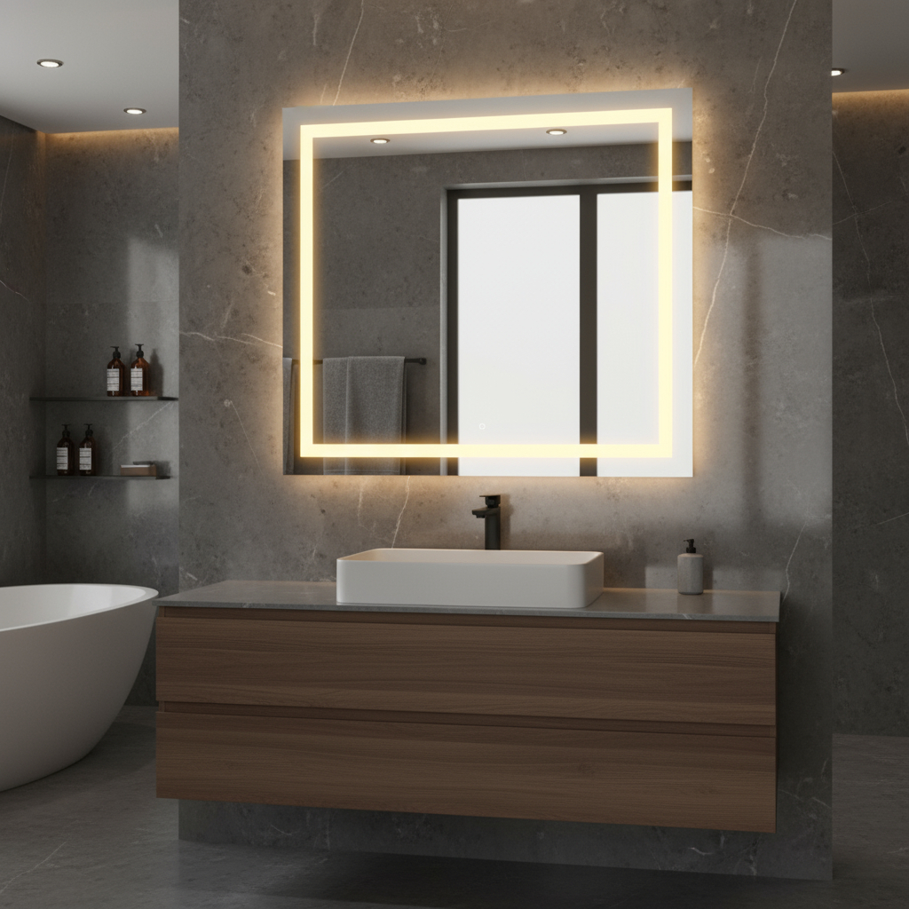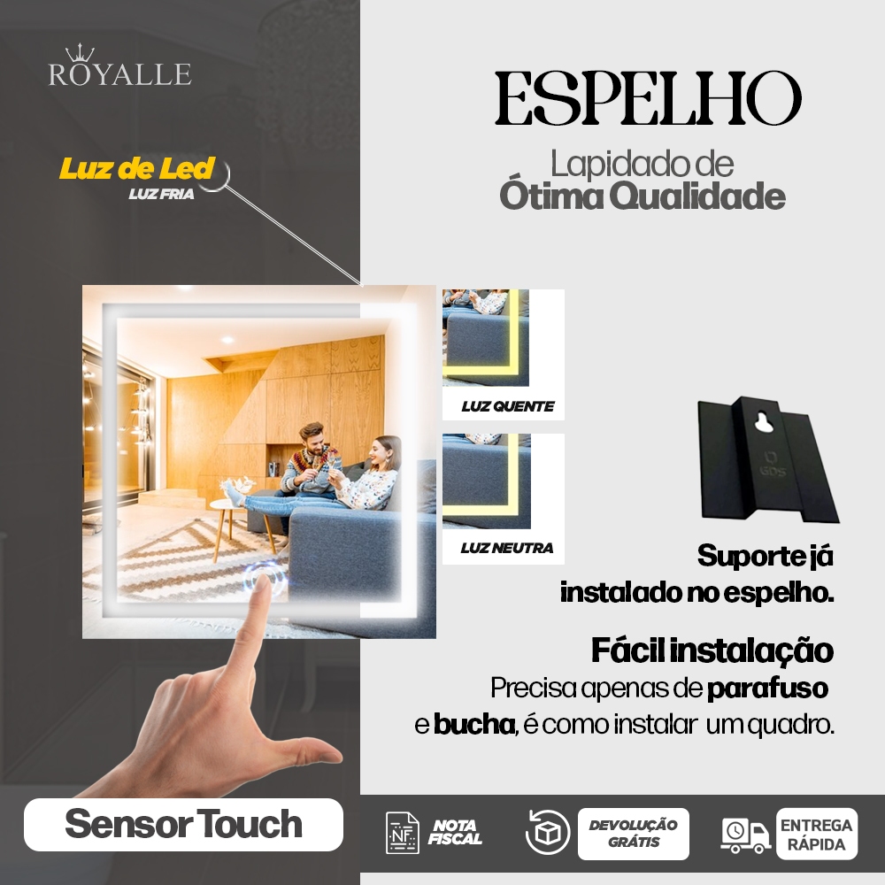 Espelho LED Quadrado Jateado 3 Cores Lapidado Vários Tamanhos Banheiro Luxo