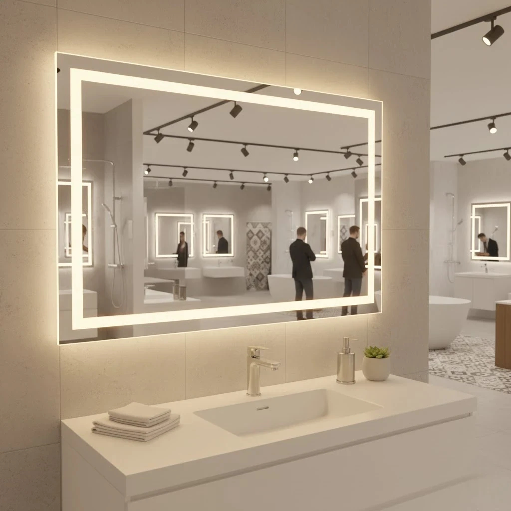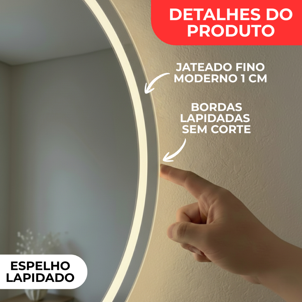 Espelho Retangular Jateado Fino 70x50cm Lapidado com LED 3 Cores Touch para Decoração e Maquiagem