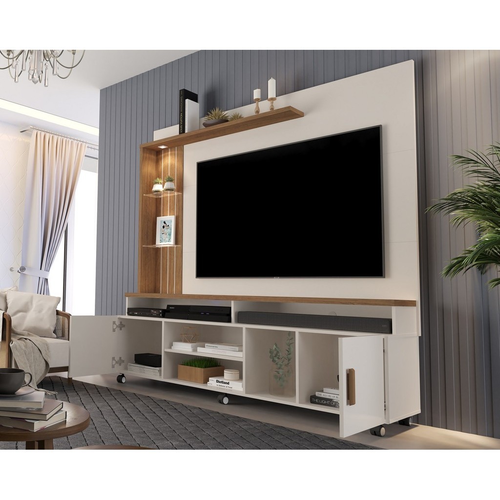 Estante Home Ocean Para Tv Até 65 Polegadas -2 Portas e Nicho Leds -Rodizio Off-White/Canela
