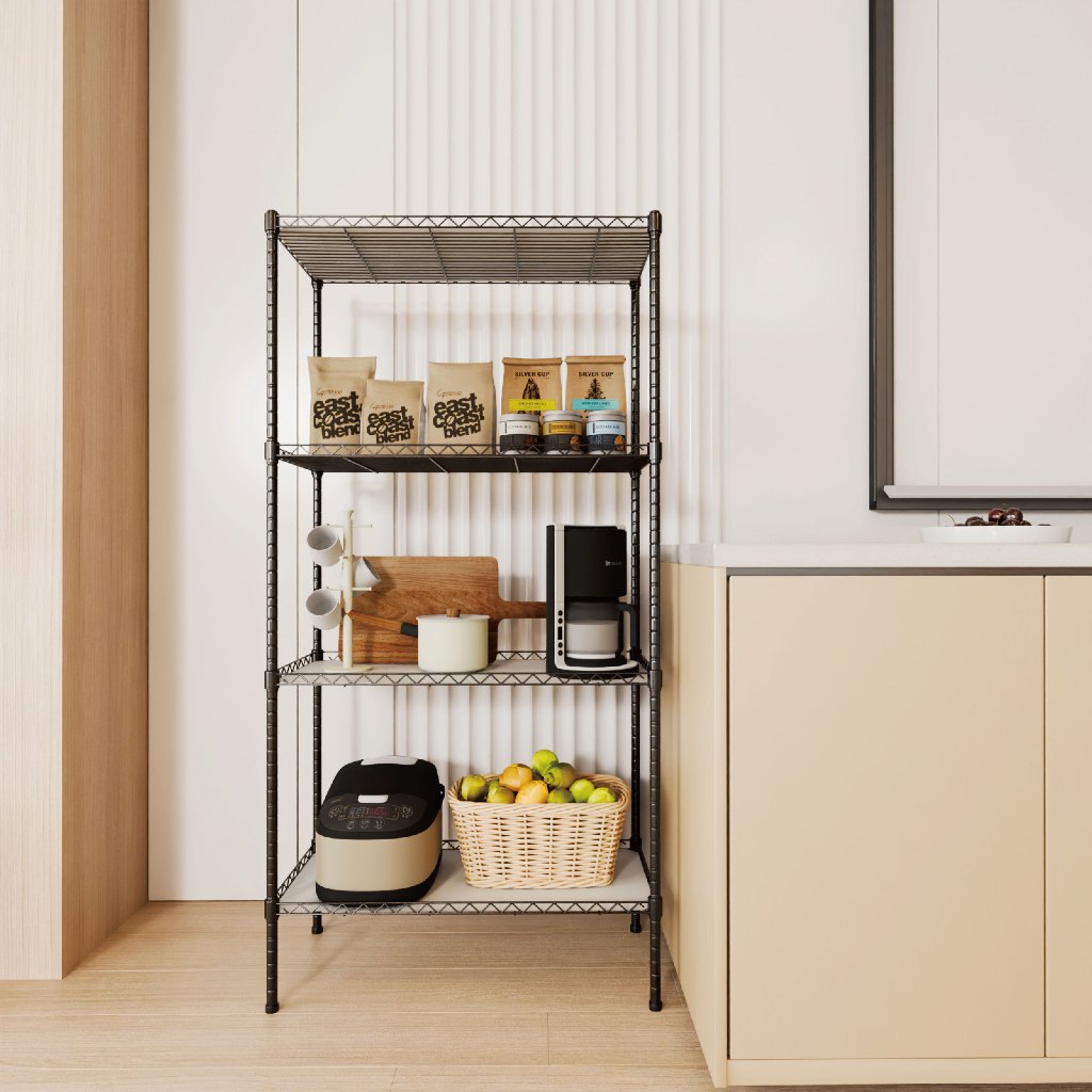 Estante de Metal 4 Prateleiras Ajustáveis Preta Compacta para Cozinha Banheiro Quarto até 200kg