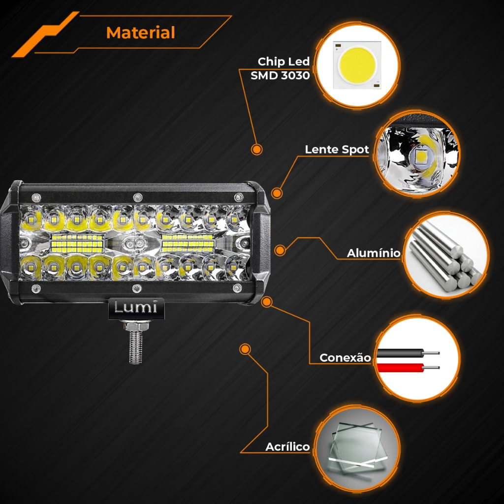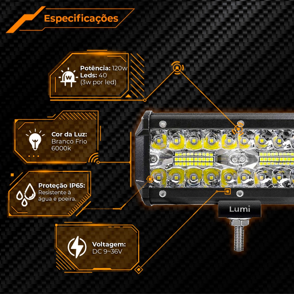 Farol De Barra Alto Potencia 40 LED 120w 12-60V 17cm IP65 Branco Frio