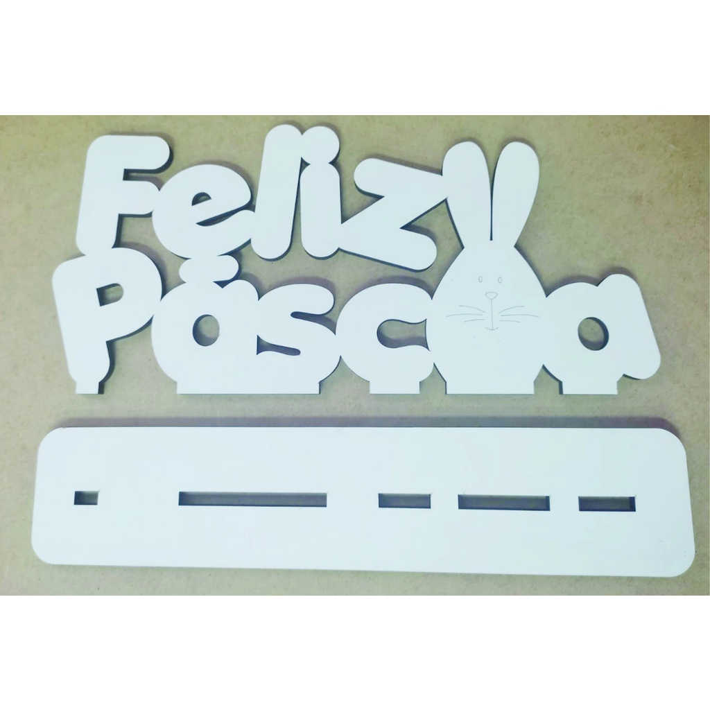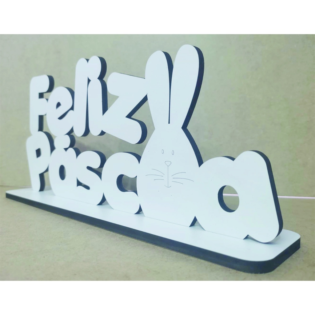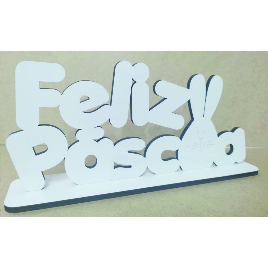 Feliz Páscoa em MDF branco 3 mm com base para mesa 14 cm de altura
