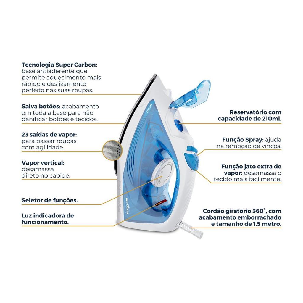 Ferro de Passar a Vapor Britânia 210ml Base Antiaderente BFV07