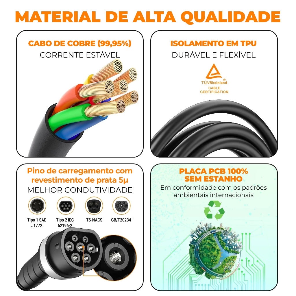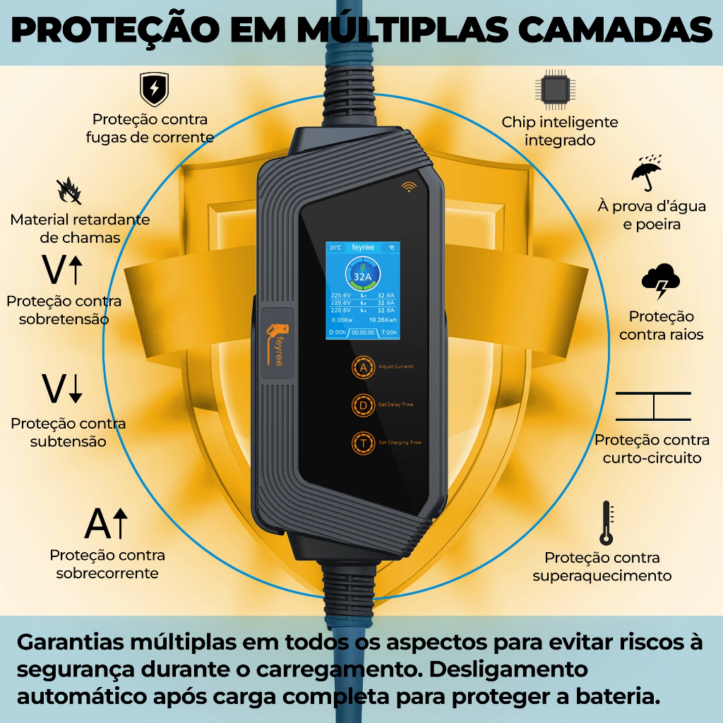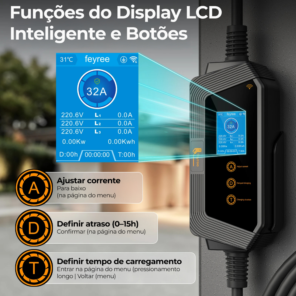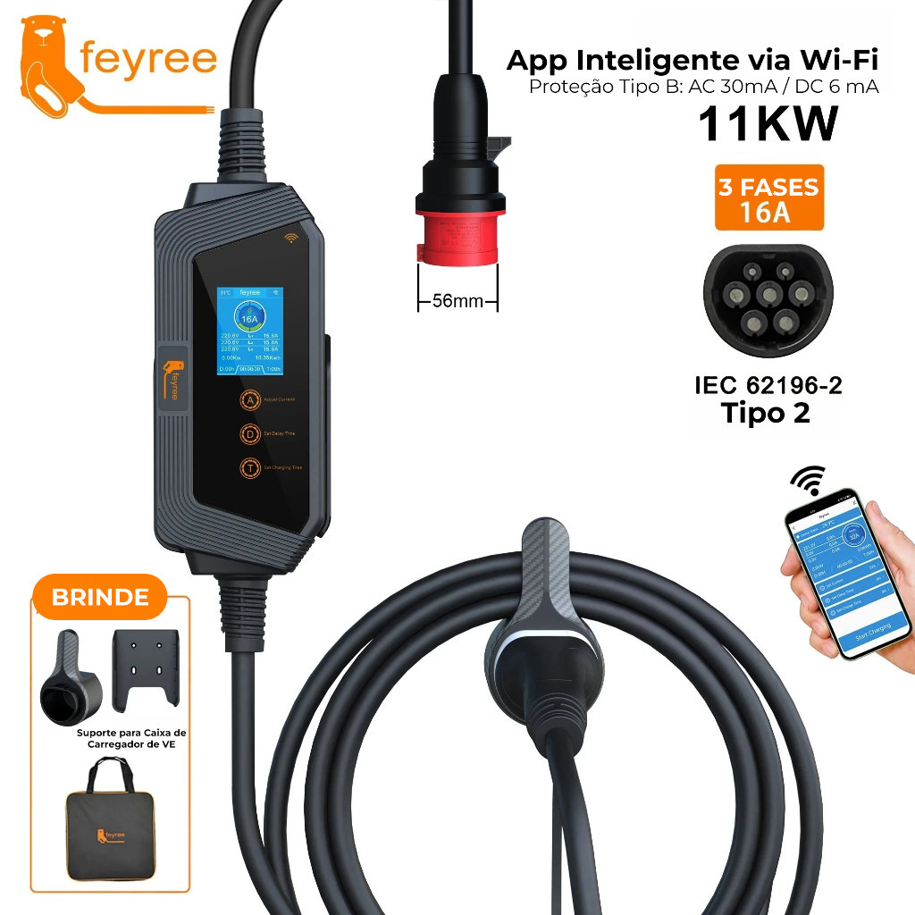 Feyree Carregador Carro Elétrico Portátil 22kw 11Kw 3P 32A 16A Tipo2 Com App IP66 à prova d'água Com LCD