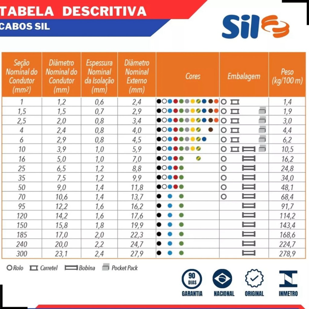Fio Cabo Flexível 6mm Antichamas SIL 100% Cobre Rolo 6mm Com 100m 750v Cor Preto - Original Sil