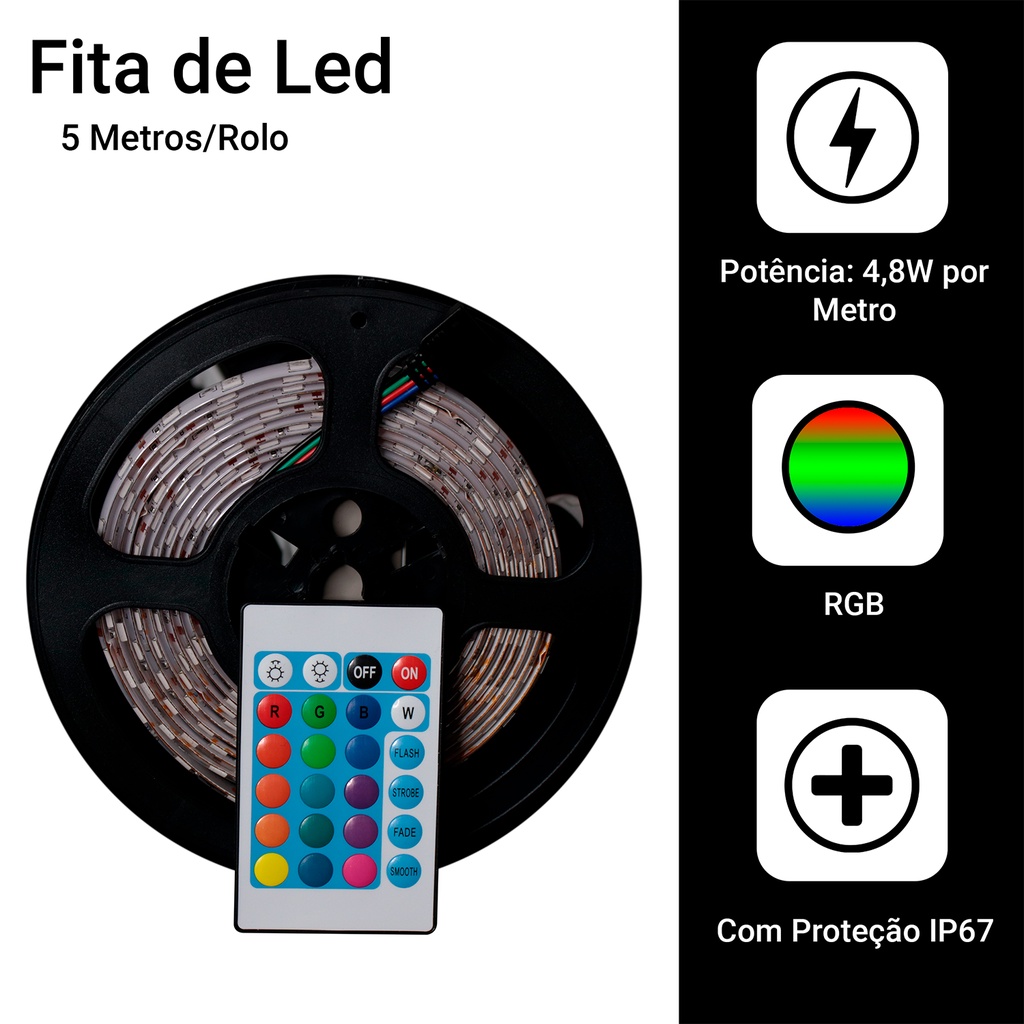 Fita Led Rgb 5050 Rolo 5m 300 Leds Ip65 Com Controle e Fonte