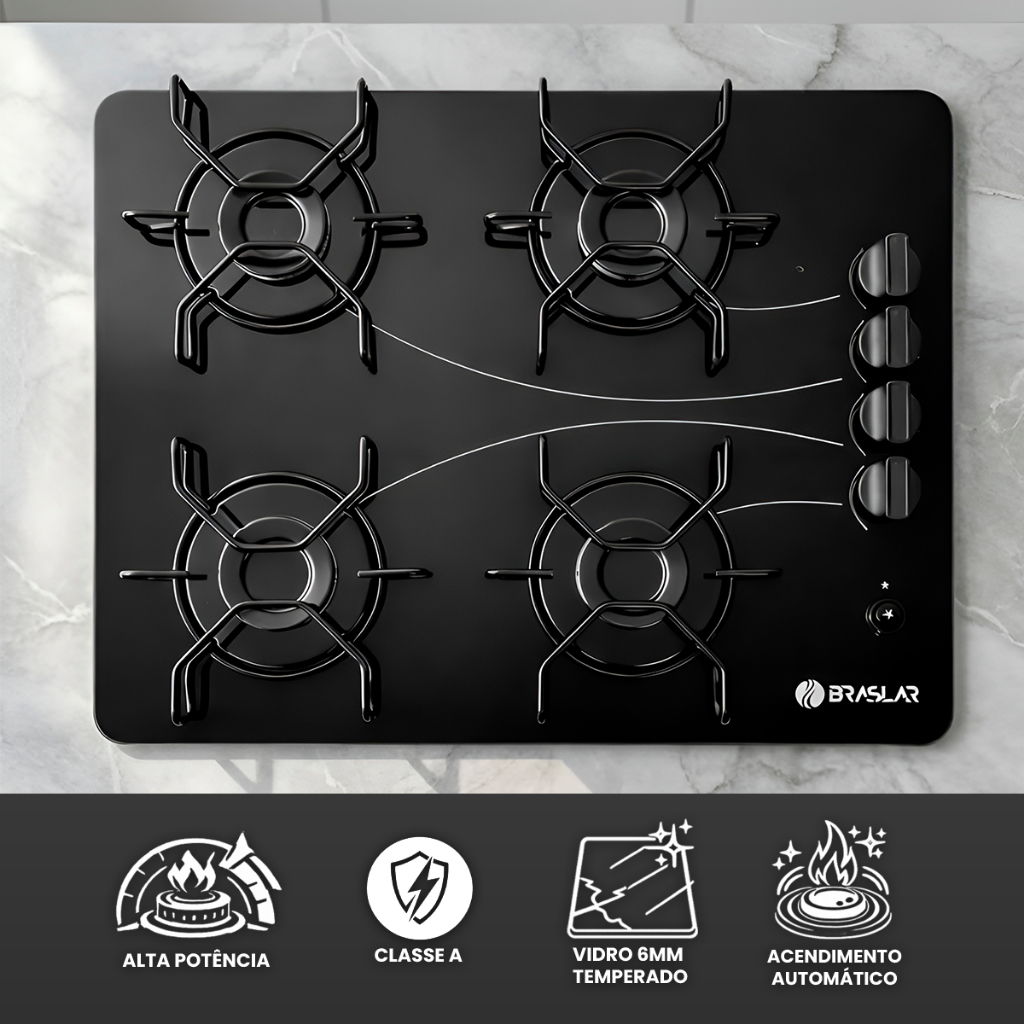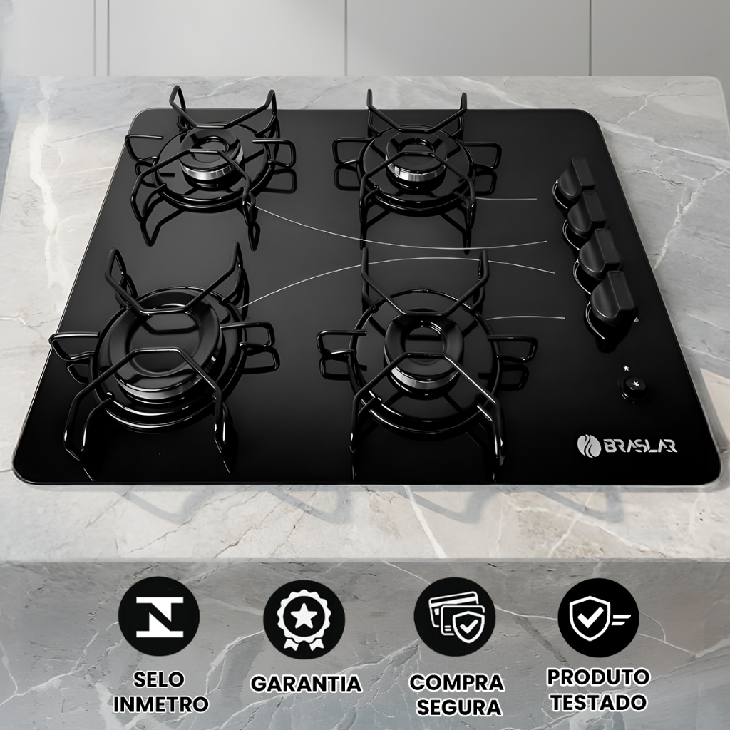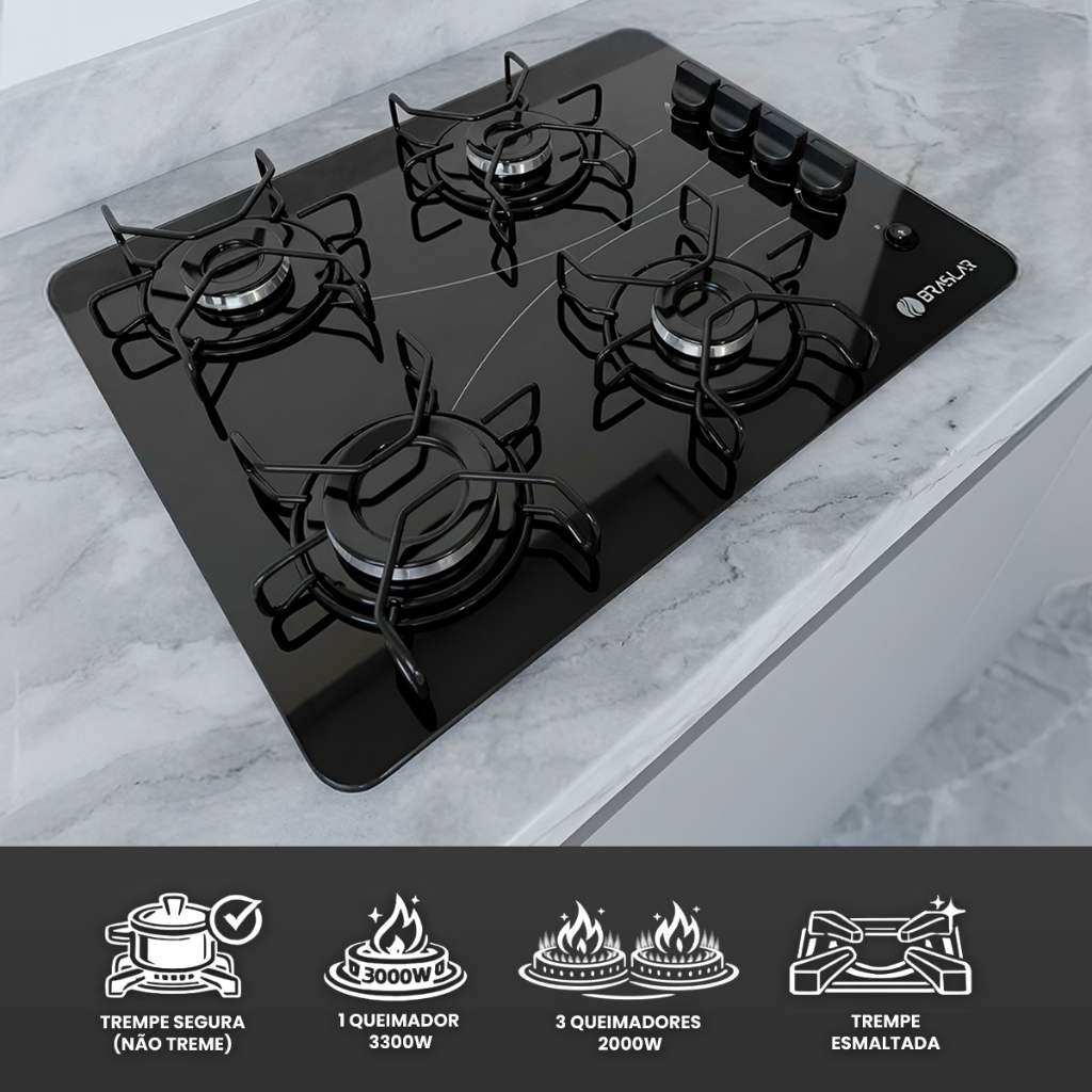 Fogão Cooktop 4 Bocas a Gás Ultra Chama 127V/220V Bivolt Acendimento Automático Vidro Braslar