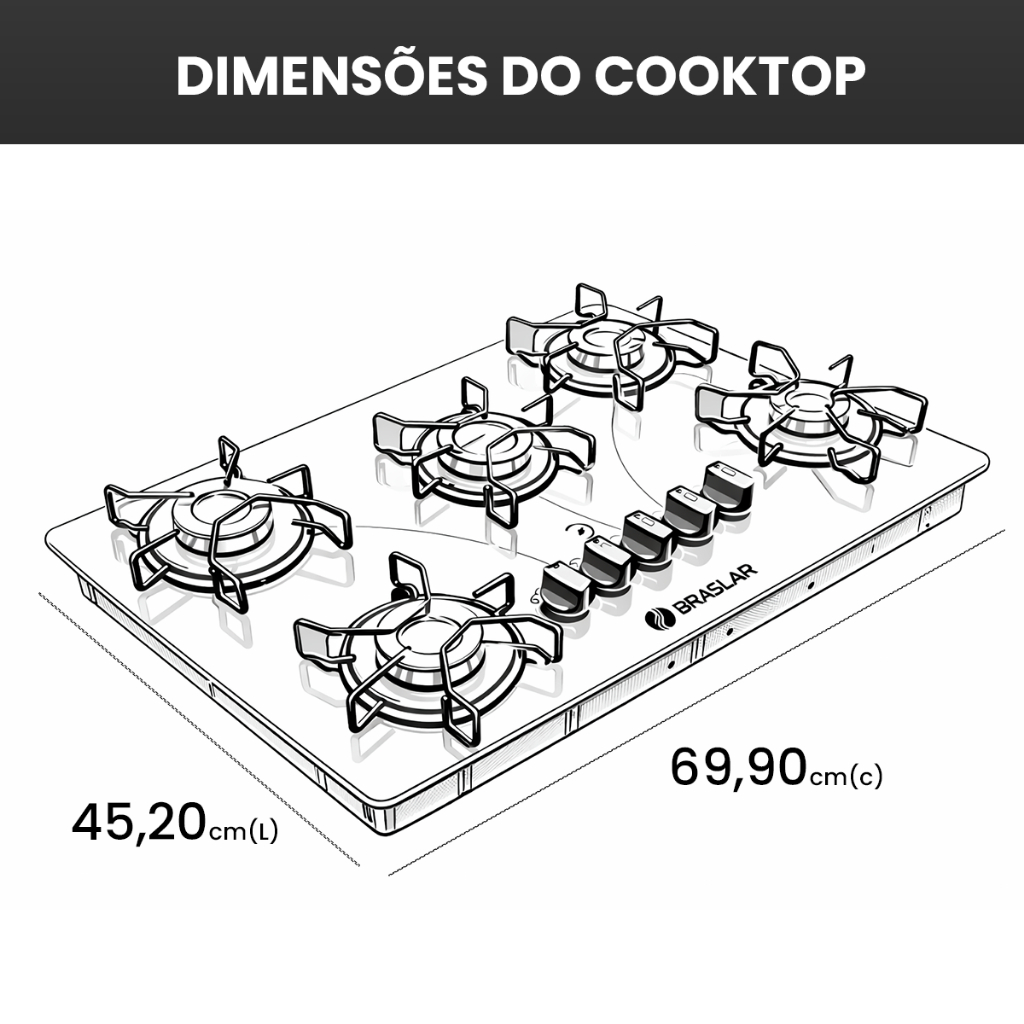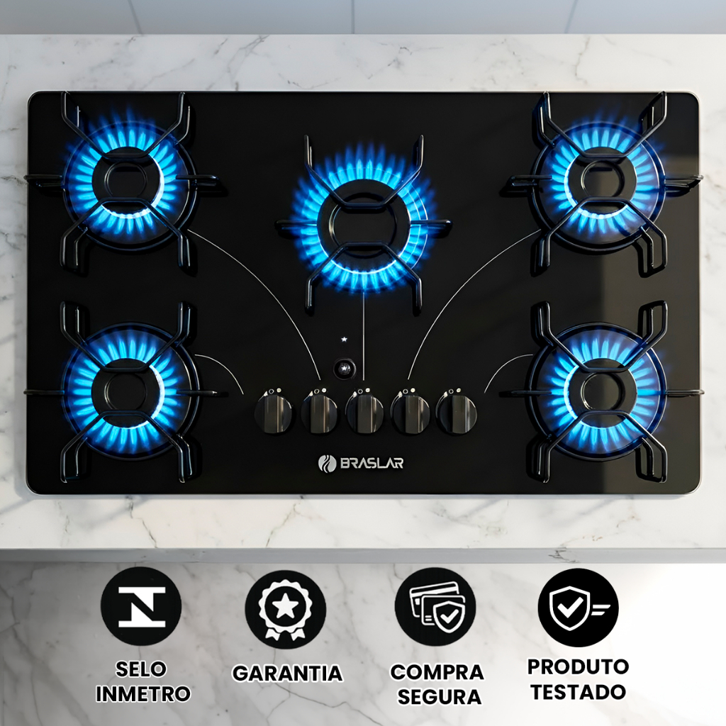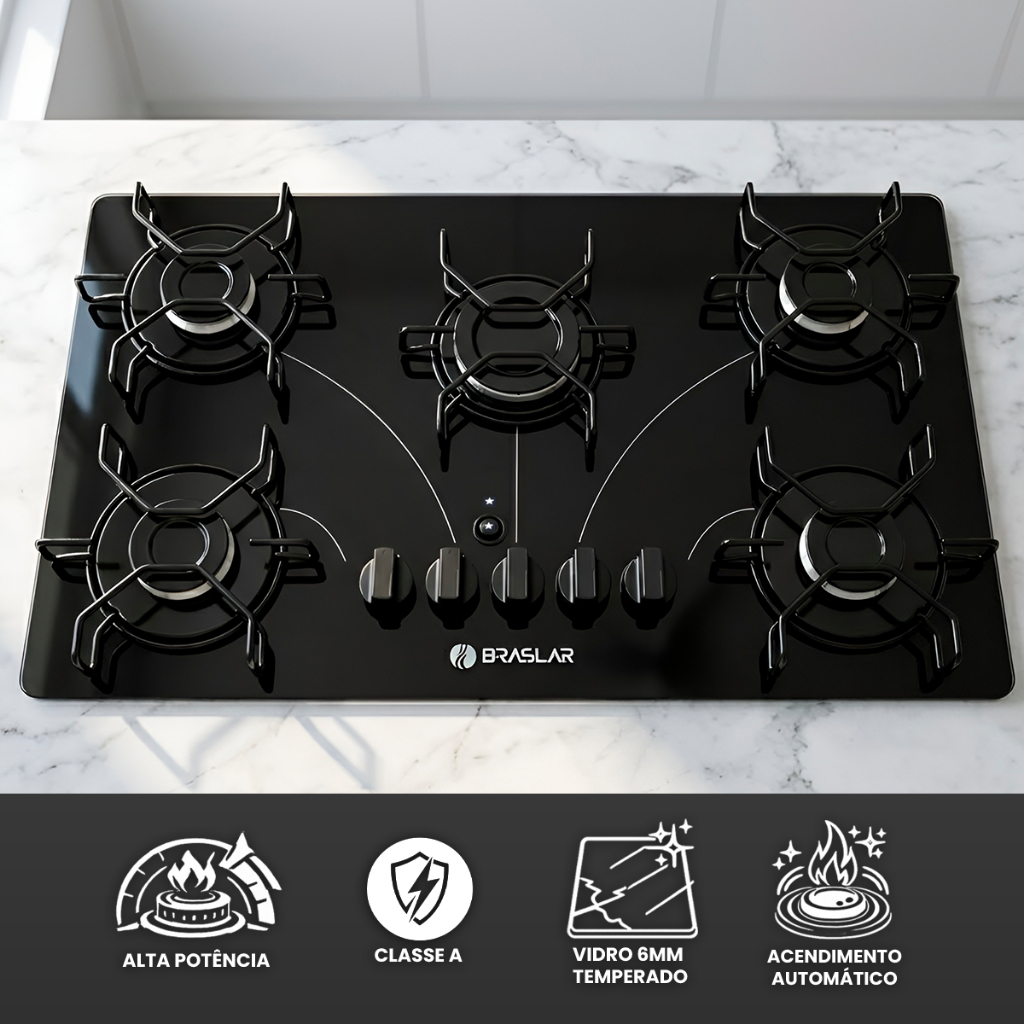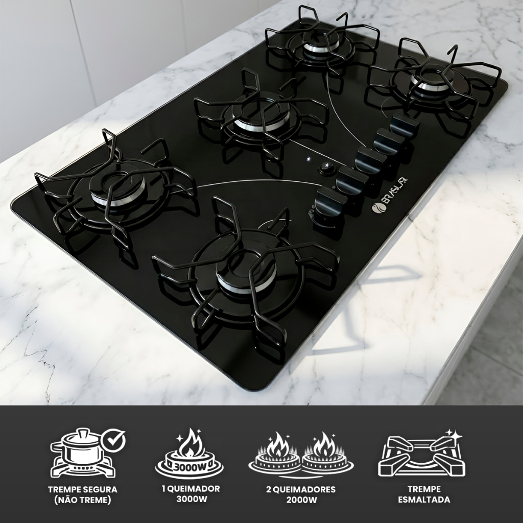 Fogão Cooktop 5 Bocas a Gás Ultra Chama 127V/220V Bivolt Acendimento Automático Vidro Braslar