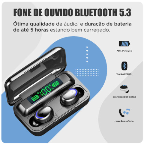 Fone Sem Fio F9-5 - Bluetooth 5.3 - Com Função Power Bank(F9) Power Bank 2 em 1 + Cancelamento de Ruído Display LED e IP