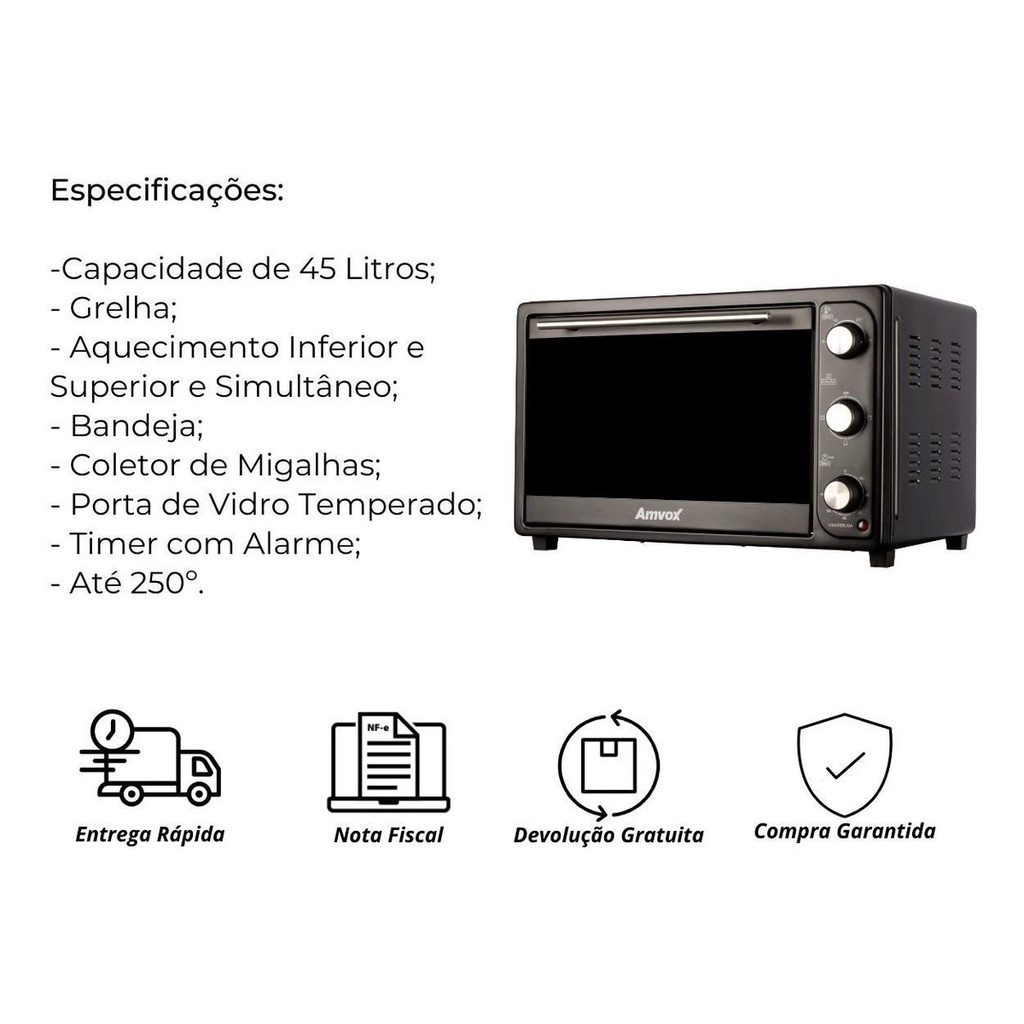 Forno Elétrico Bancada Timer Alarme 45l 110v Black Amvox