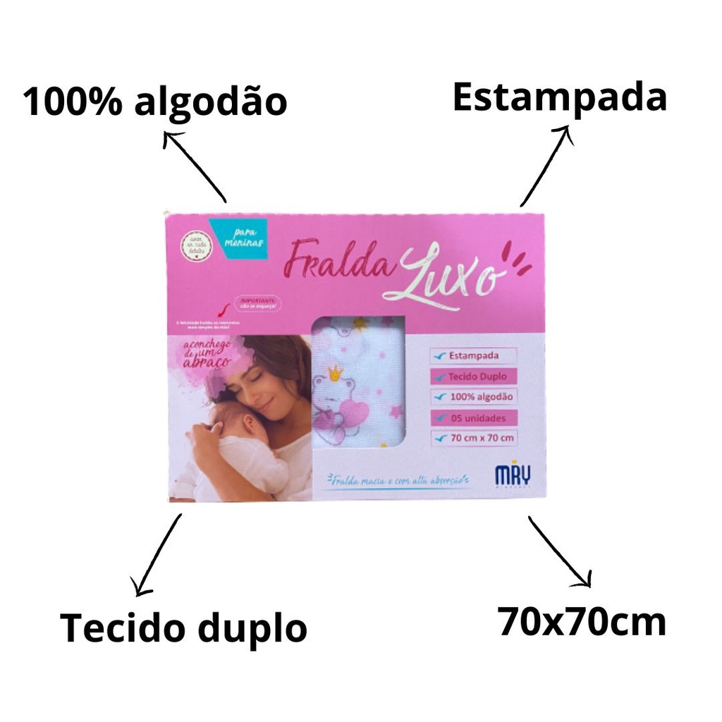 Fralda de Pano Bebê Luxo Tecido Duplo 100% Algodão Estampada 70x70cm Caixa C/5 Minasrey