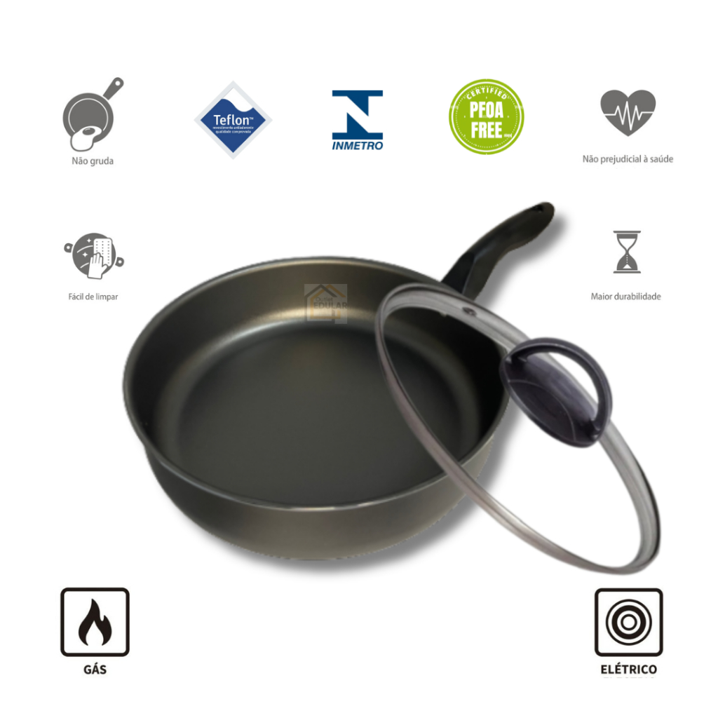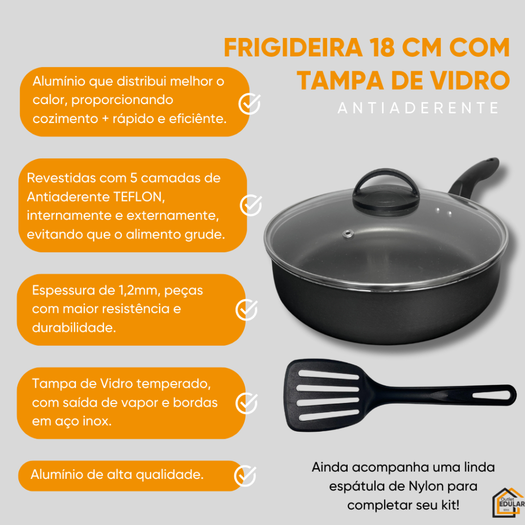 Frigideira 18 cm Alta Funda 5 Camadas Antiaderente Teflon Tampa de Vidro Espátula Nylon Cor Grafite