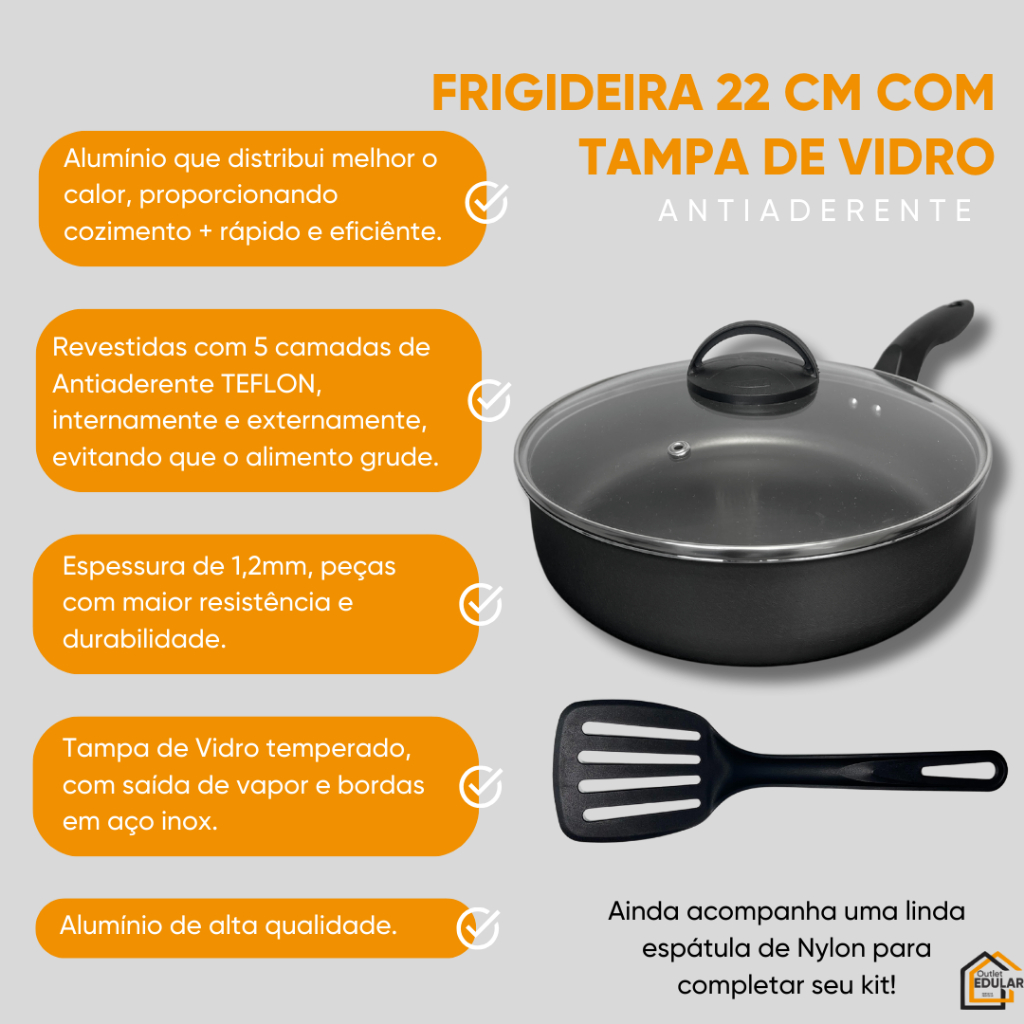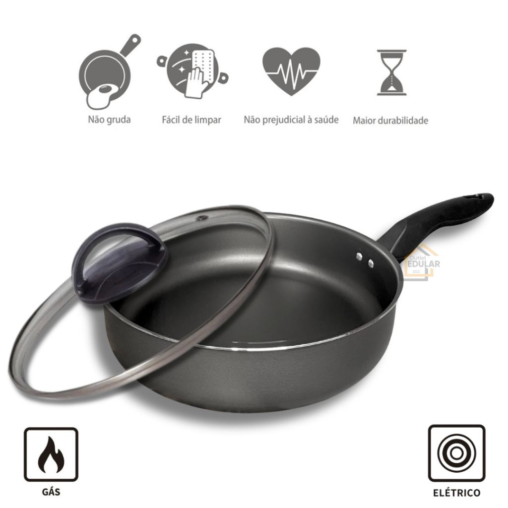 Frigideira 22 cm Antiaderente Teflon com Tampa de Vidro Cor Grafite