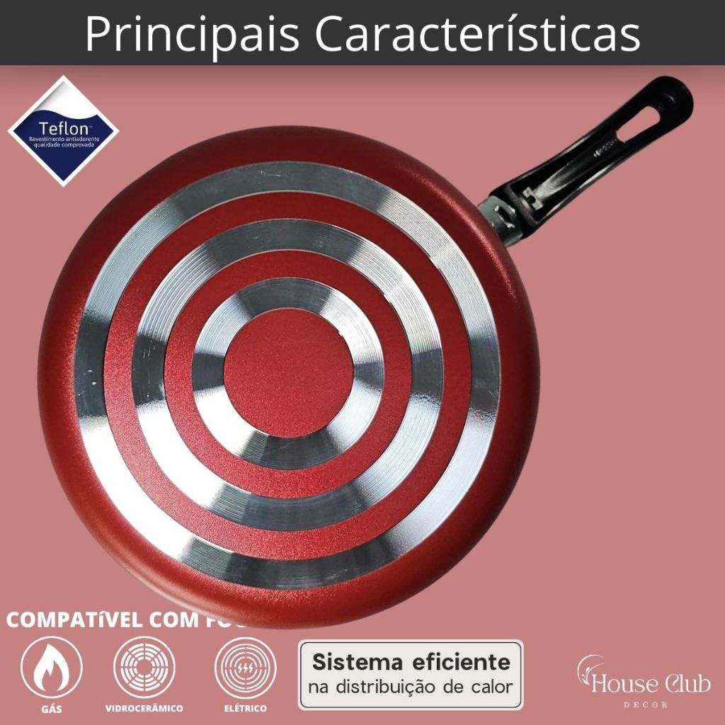 Frigideira Alta 22 cm Antiaderente 5 Camadas De Teflon com Tampa de Vidro Cor Vermelho e Grafite