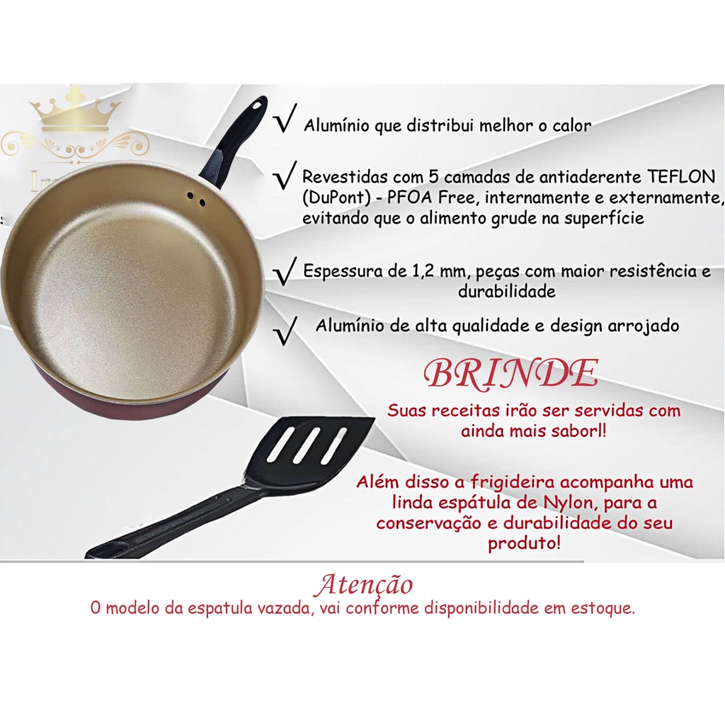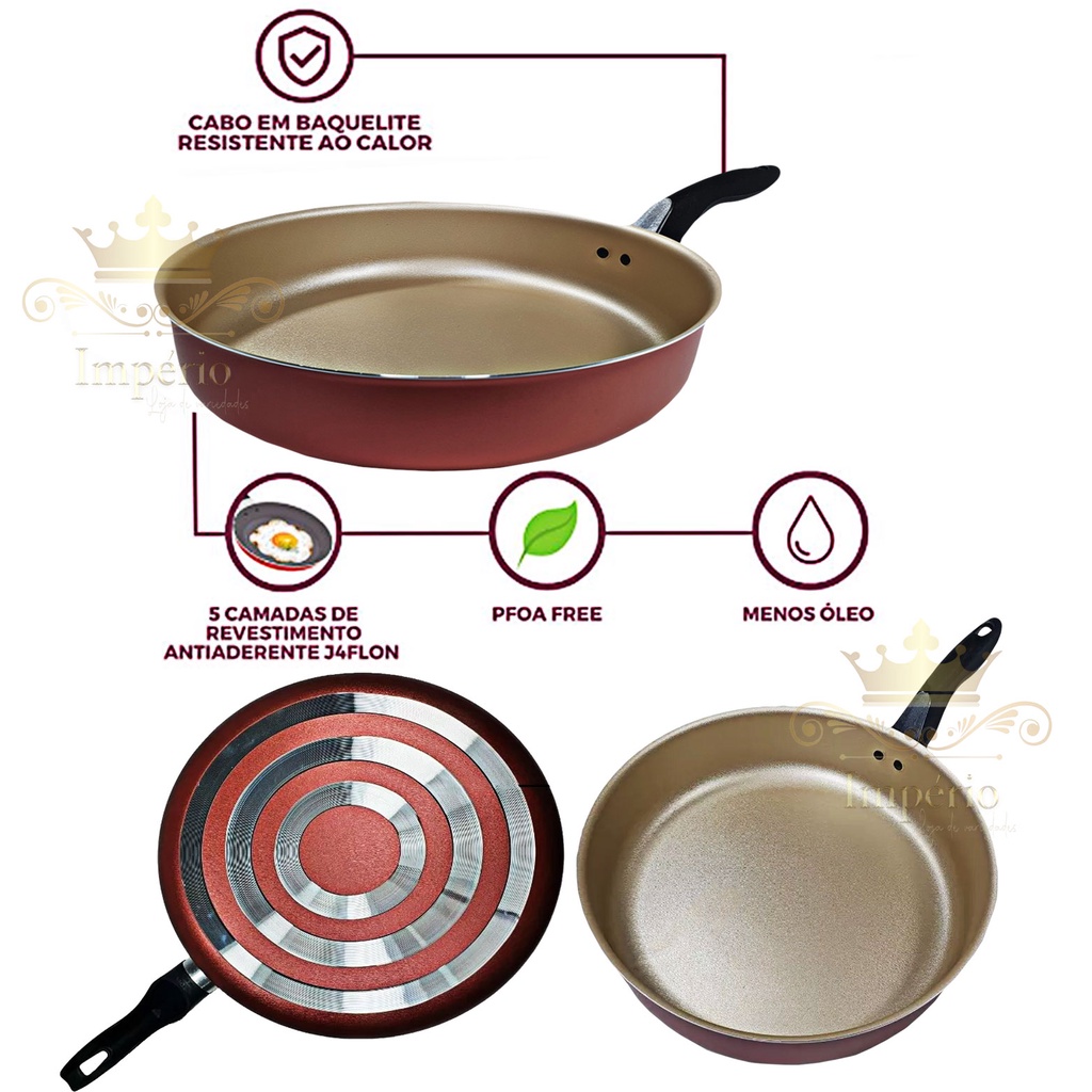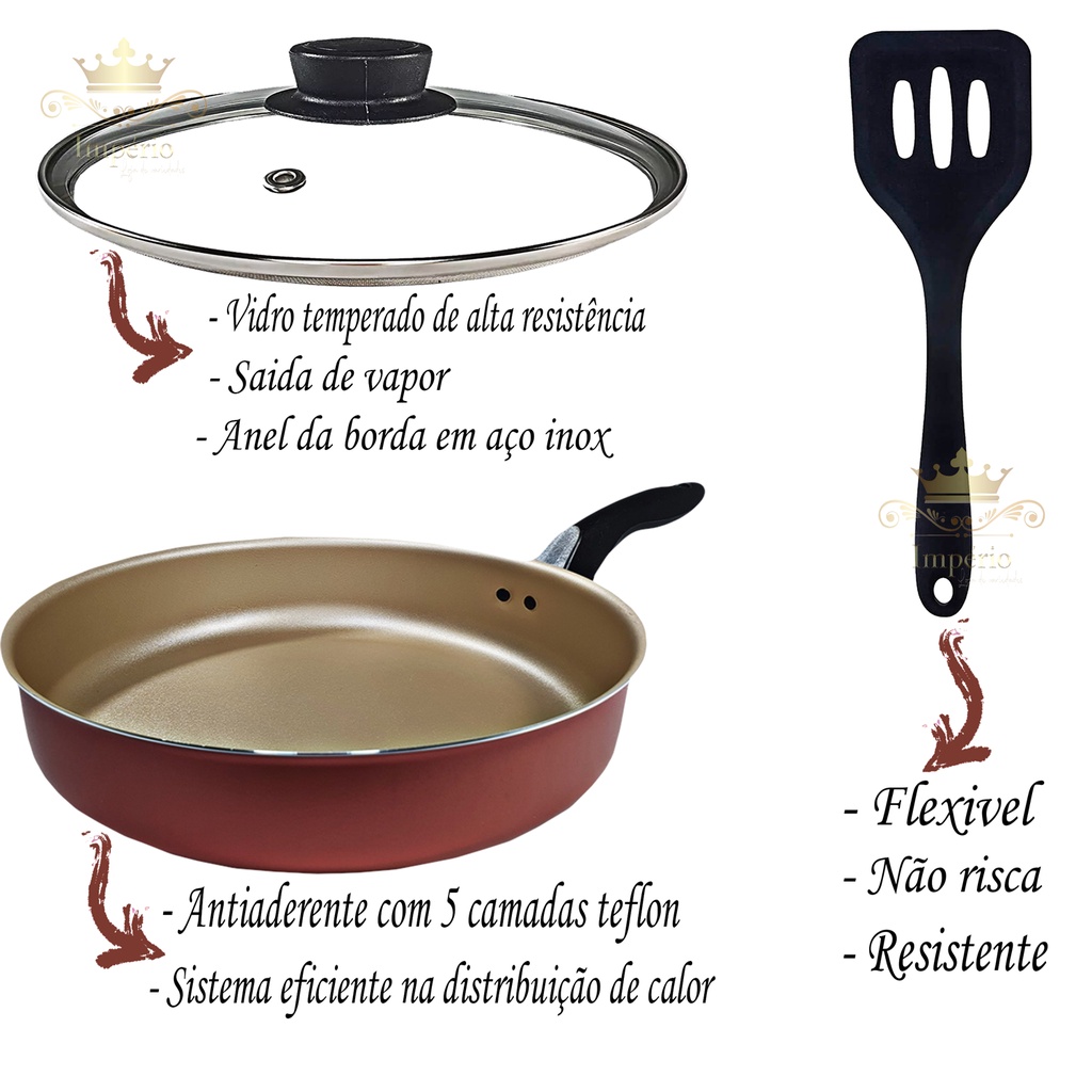 Frigideira Alta Antiaderente Com Tampa De Vidro e Espátula 24Cm Grande Teflon Cor Cereja Bege Dourado Alumínio Grosso