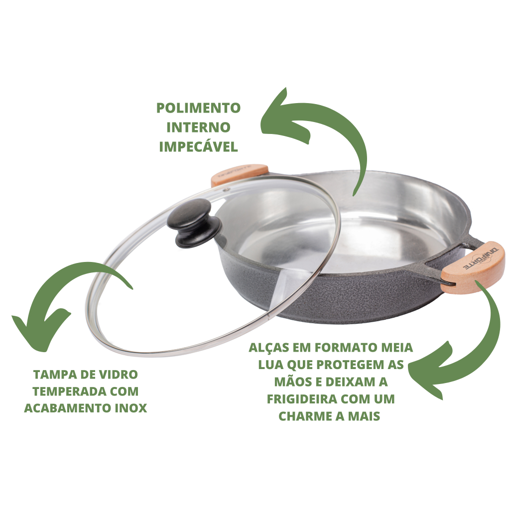 Frigideira Aluminio Fundido Grosso Preta 26 Cm Tampa de Vidro