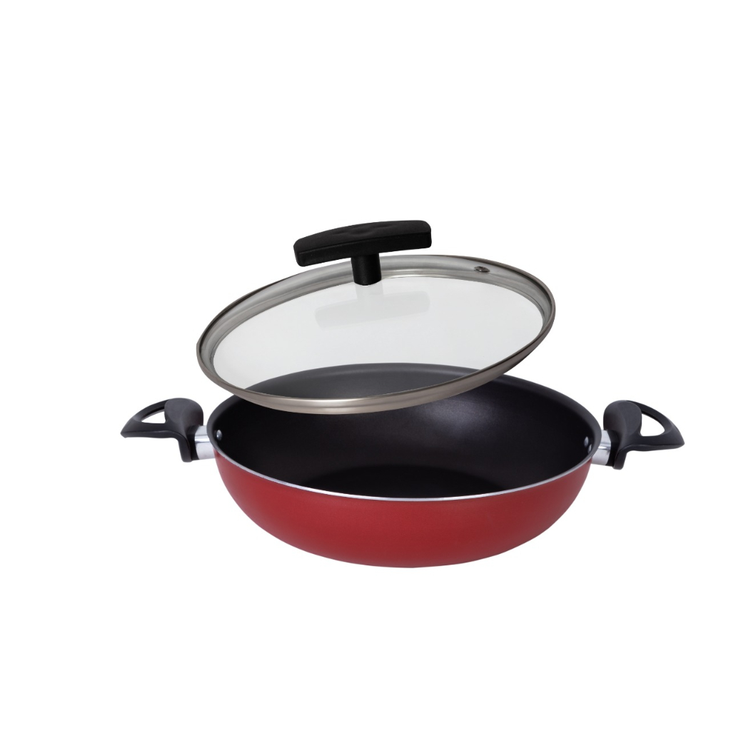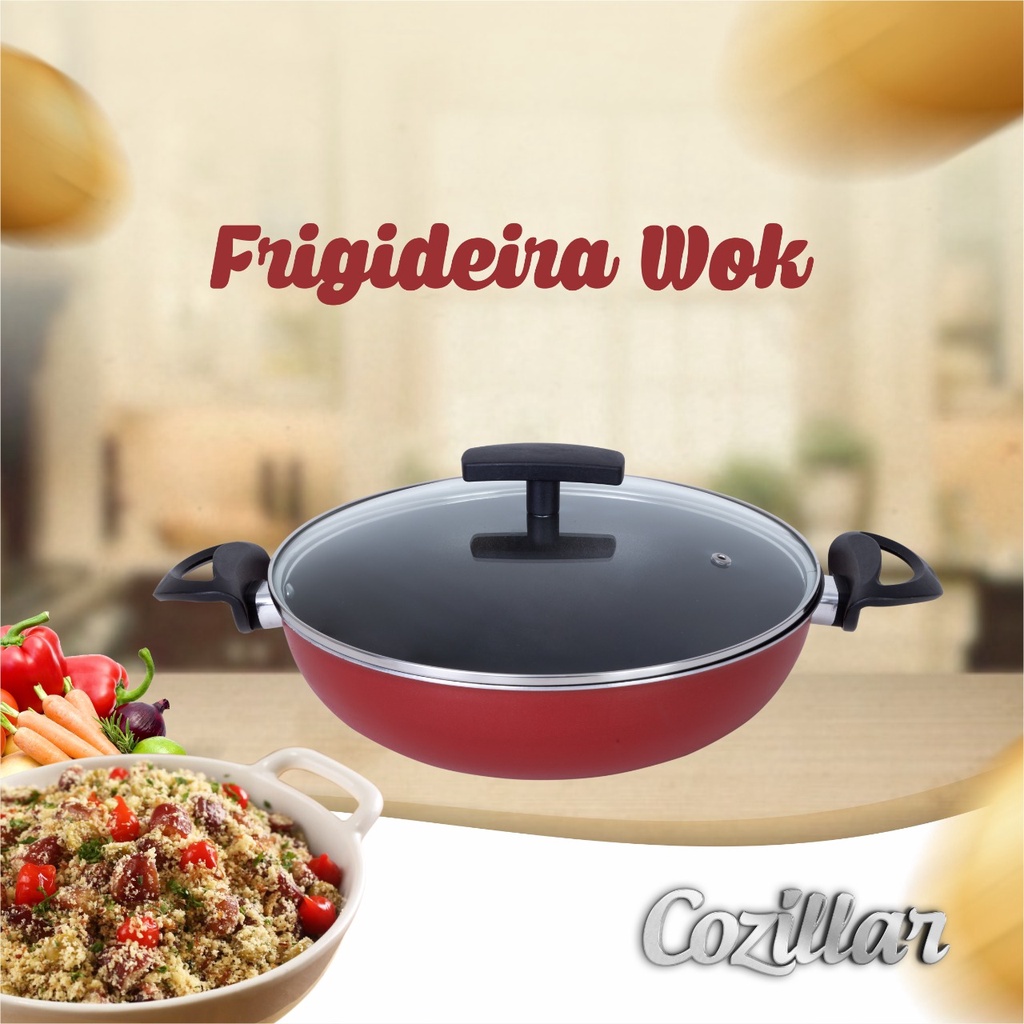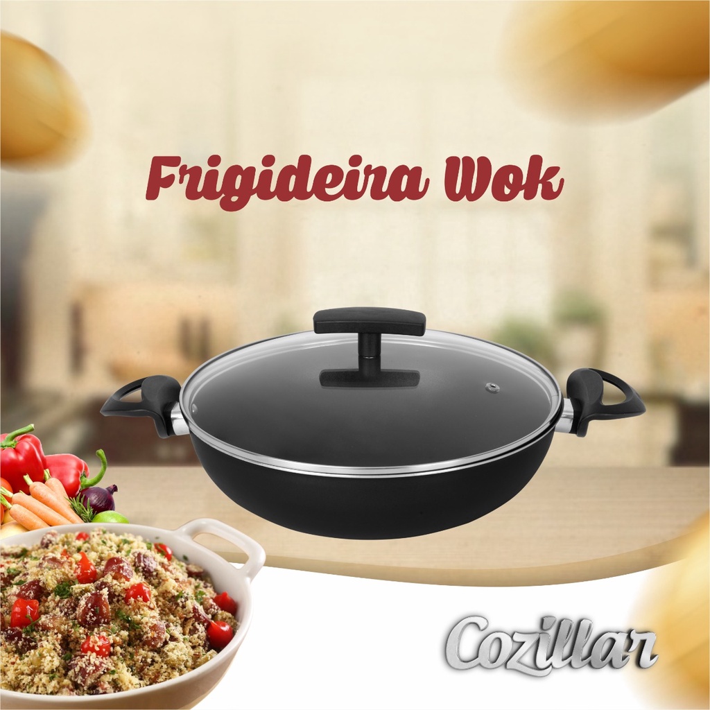 Frigideira Wok Antiaderente Panela com Tampa de Vidro 26 cm Duas Alças