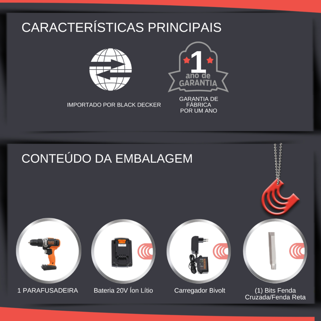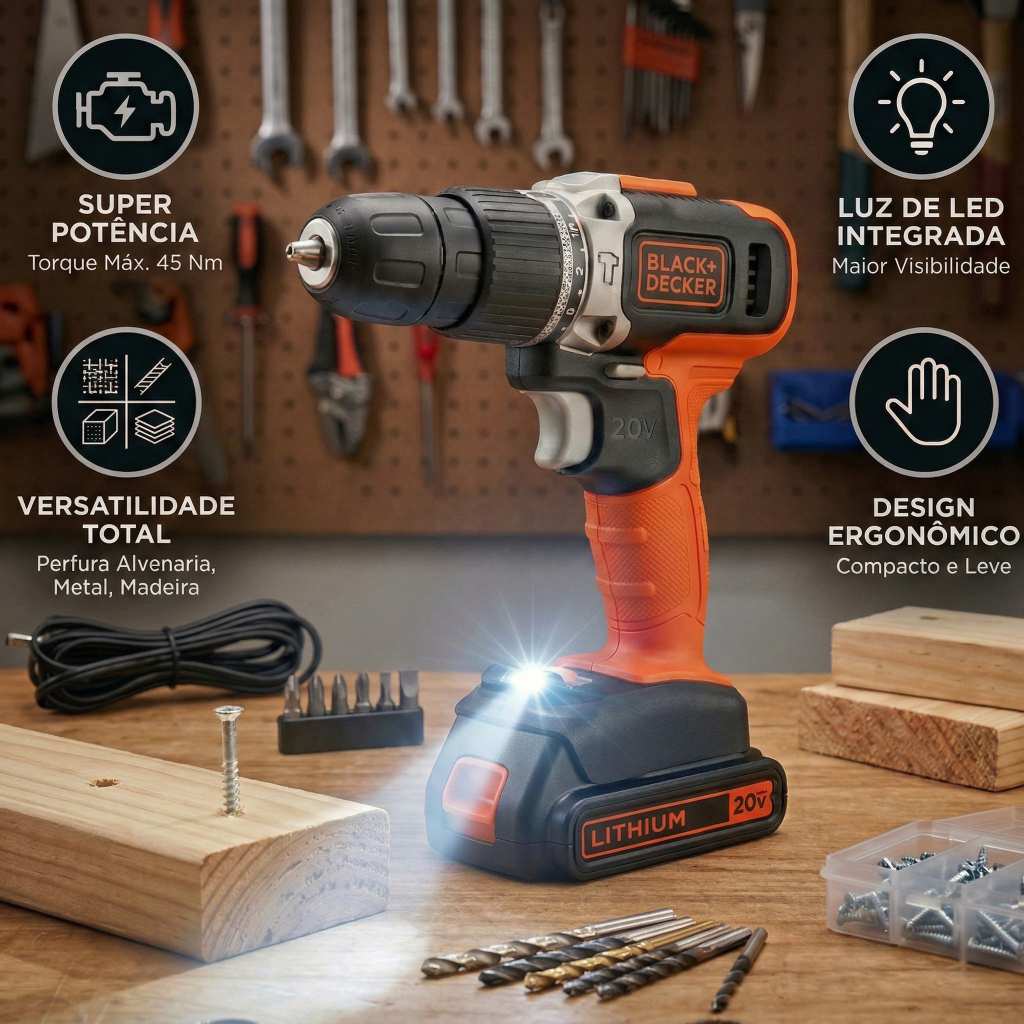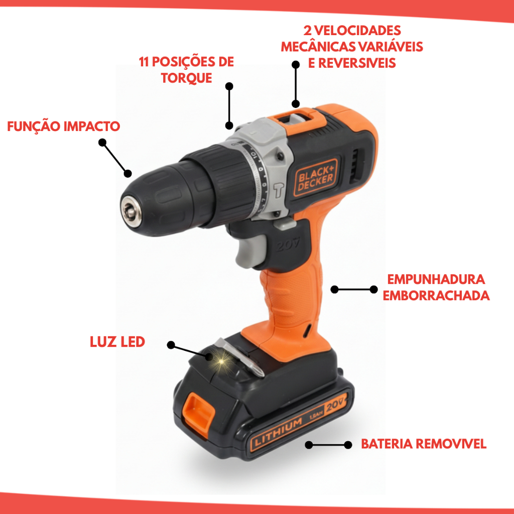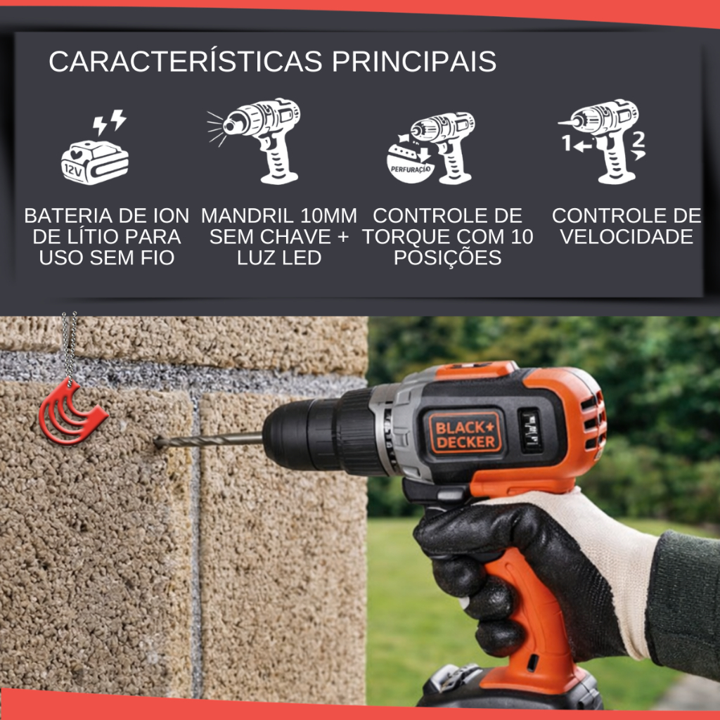 Furadeira e Parafusadeira Elétrica Com Impacto Bivolt a Bateria Sem fio 10mm Black Decker BCD704C1