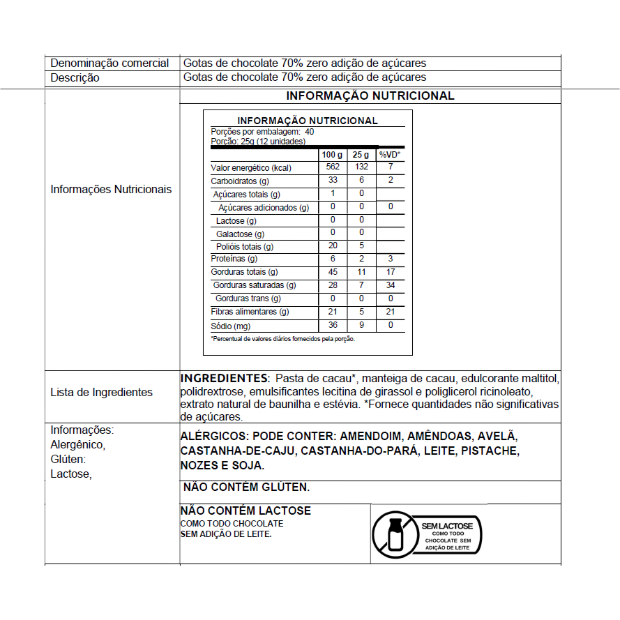 Gotas de Chocolate 70% Zero Açúcar - 1Kg - P&P