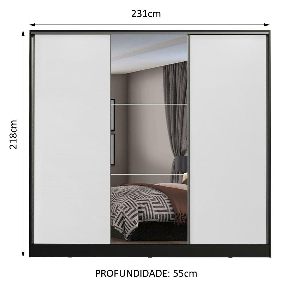 Guarda Roupa Casal 100% MDF Madesa Zurique 3 Portas de Correr com Espelho - Preto/Branco