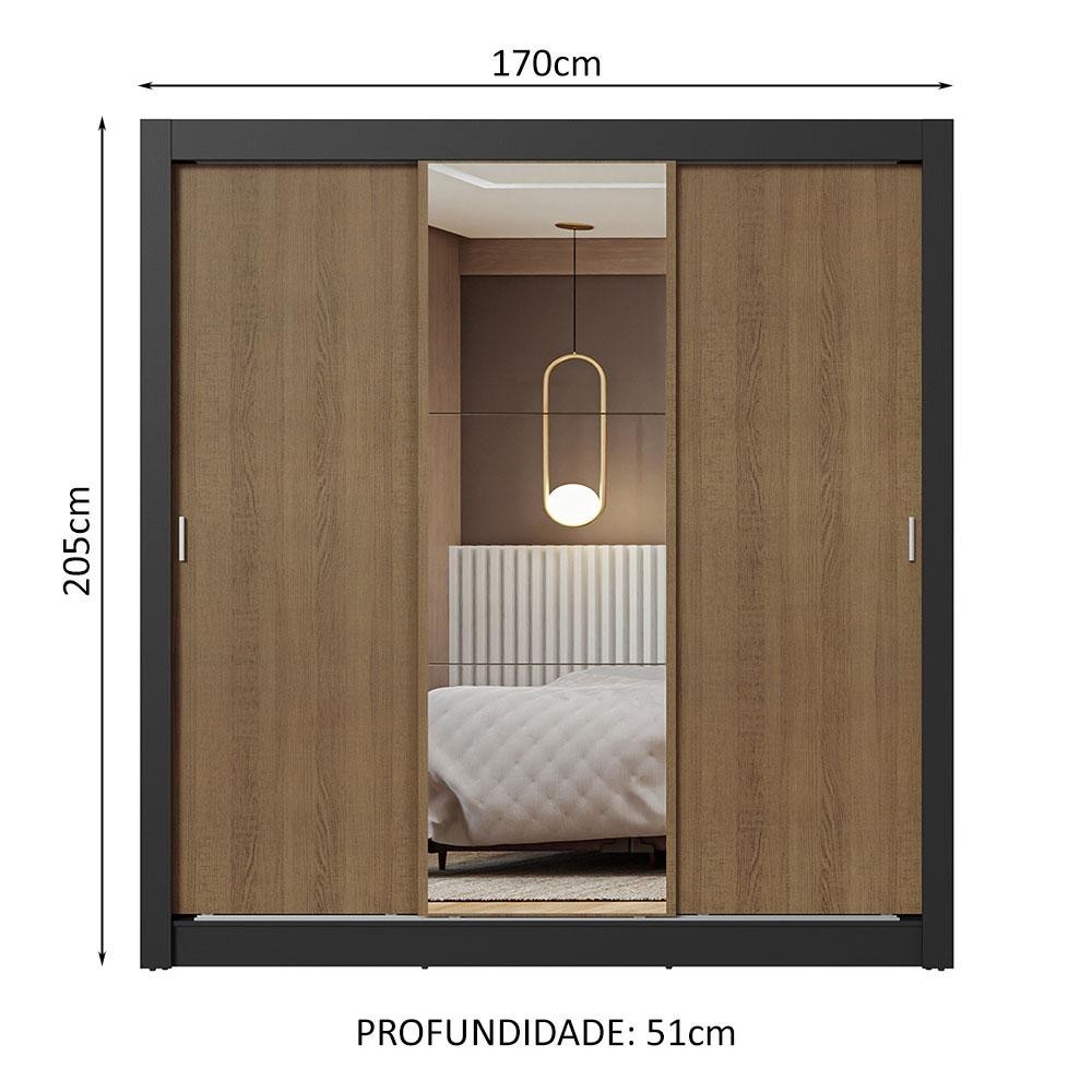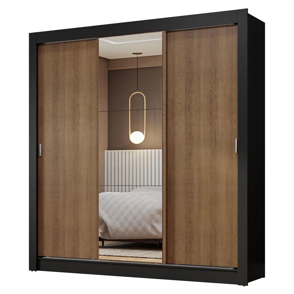 Guarda-Roupa Casal 3 Portas de Correr com Espelho Preto/Rustic Nobre Madesa