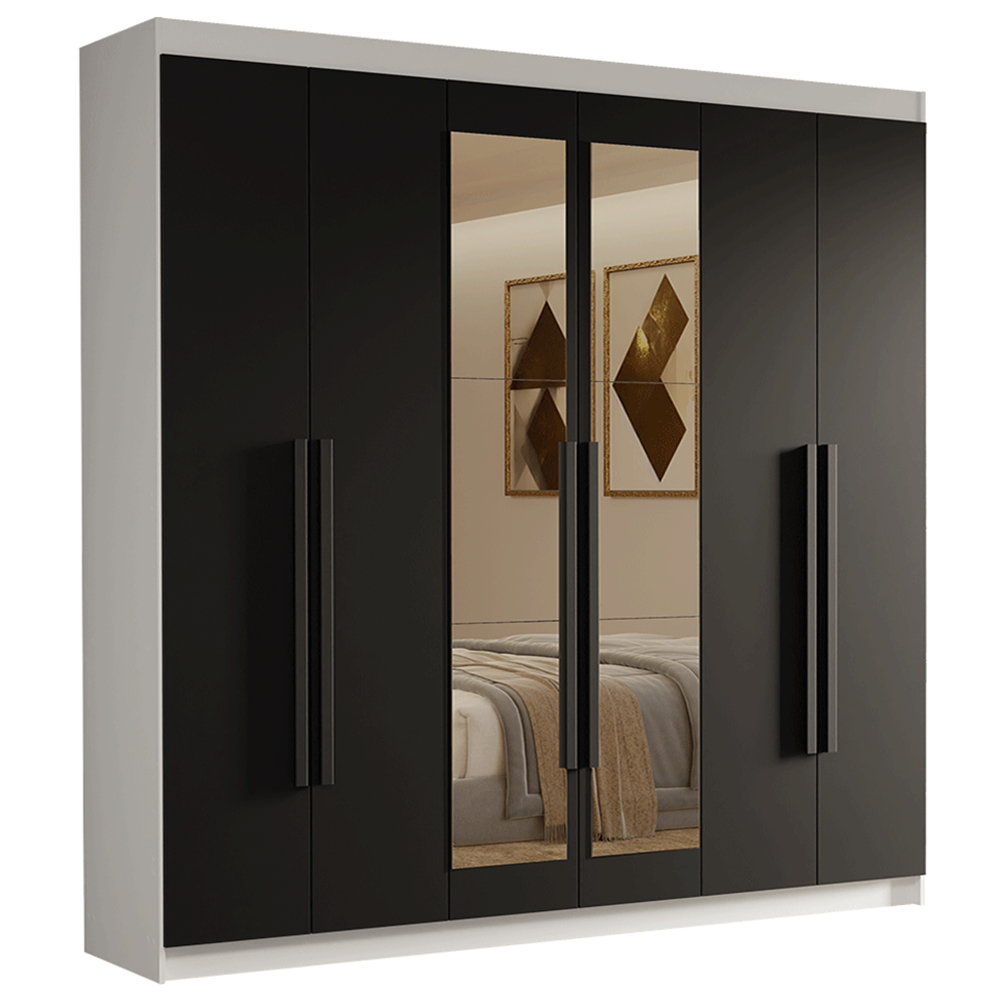 Guarda-Roupa Casal 6 Portas Batentes com Espelho Branco/Preto/Preto Venus Madesa