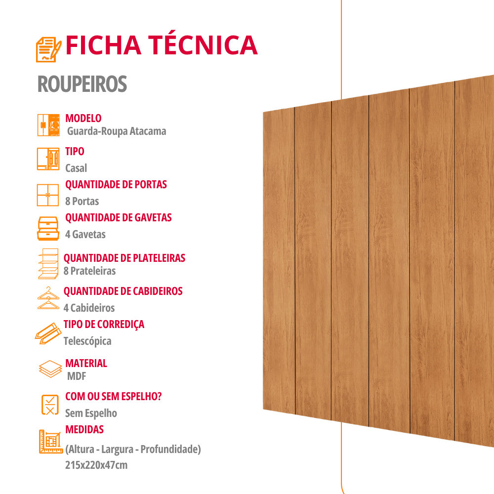 Guarda Roupa Casal Atacama 100 MDF 8 Portas e 8 Cabideiros Moderna Mobilia
