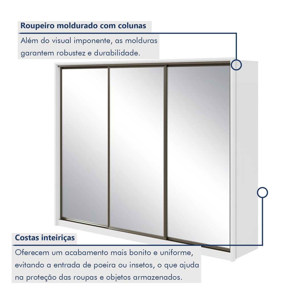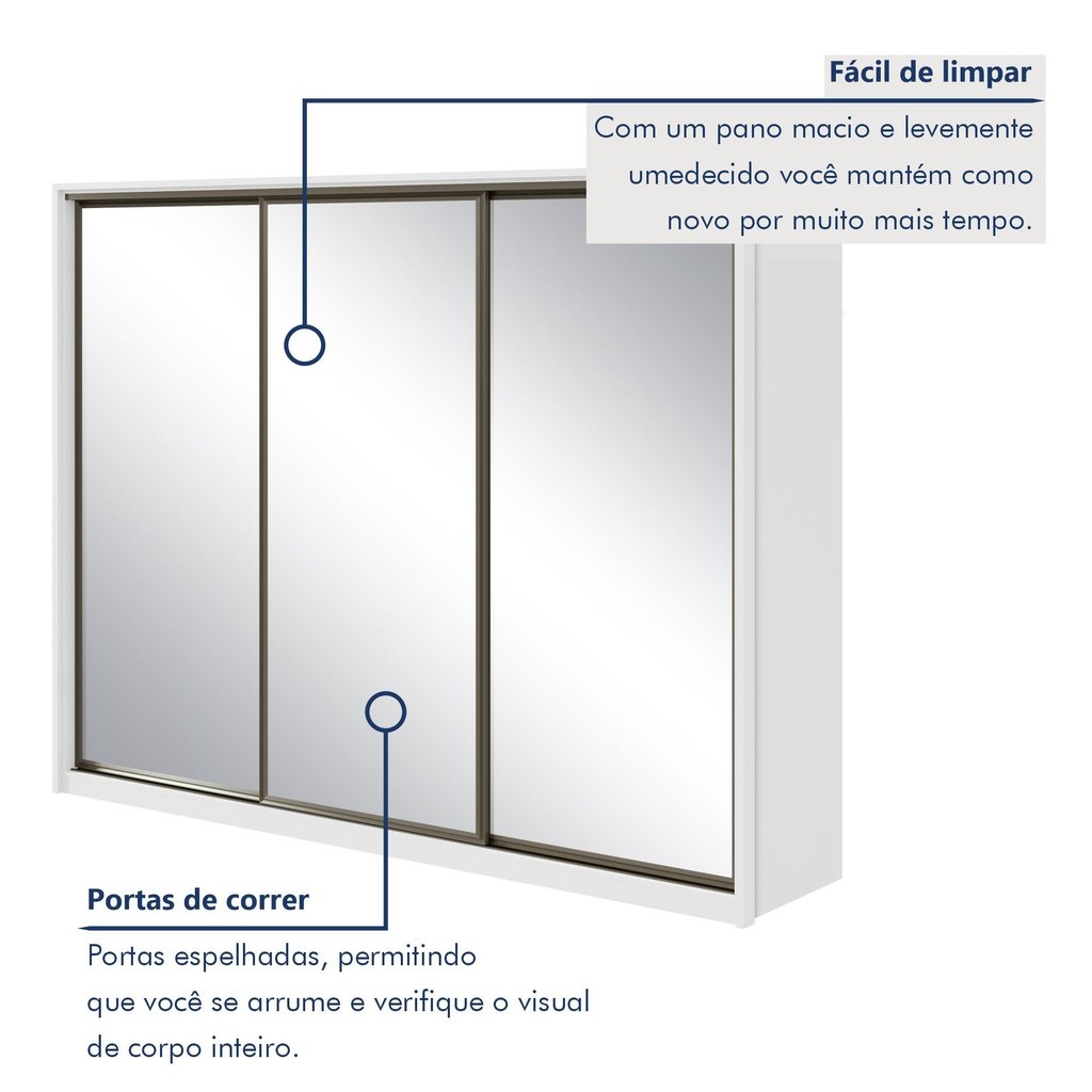 Guarda Roupa Casal com 3 Espelhos 3 Portas de Correr 6 Gavetas 270,5cm Spazio Super Glass 100% MDF Branco