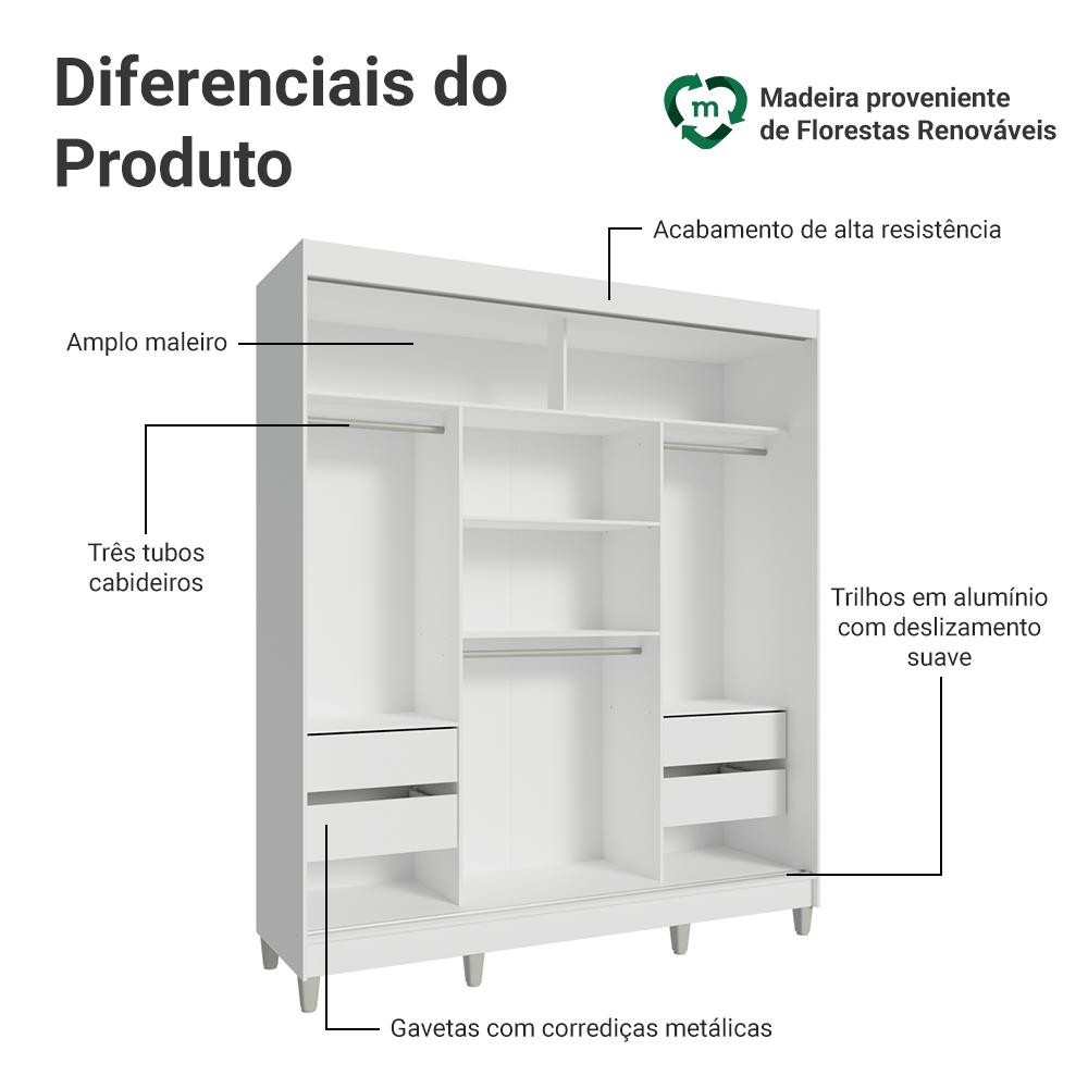 Guarda-Roupa Casal com Pés 3 Portas de Correr com Espelho Branco Reno Madesa