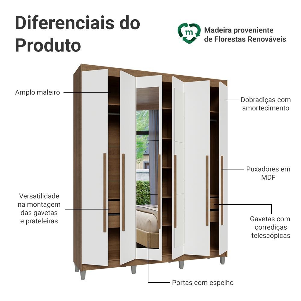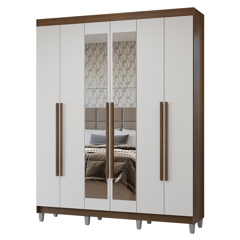 Guarda-Roupa Casal com Pés 6 Portas Batentes com Espelho Rustic/Branco/Rustic Netuno Madesa