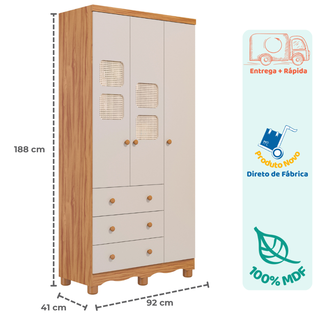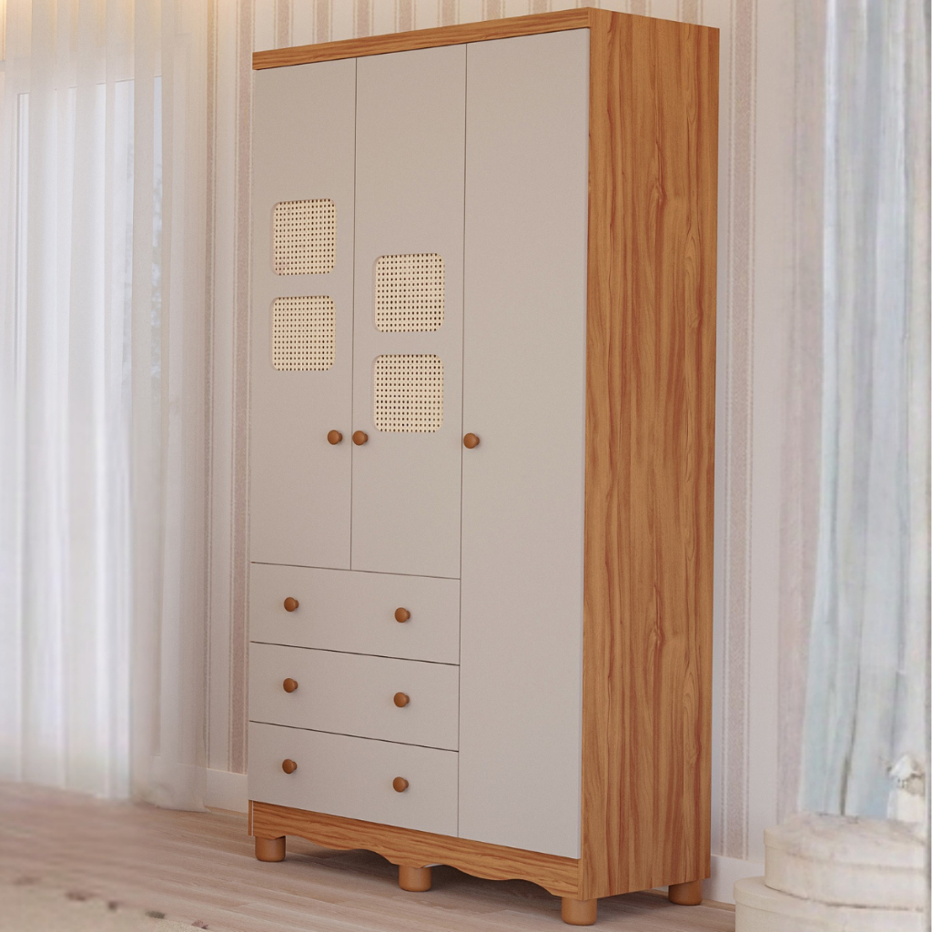Guarda Roupa Infantil Telinha Off White 3 Portas 3 Gavetas 100% MDF