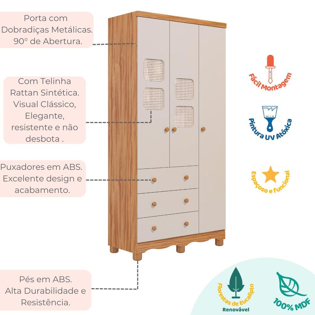 Guarda Roupa Infantil Telinha Off White 3 Portas 3 Gavetas 100% MDF