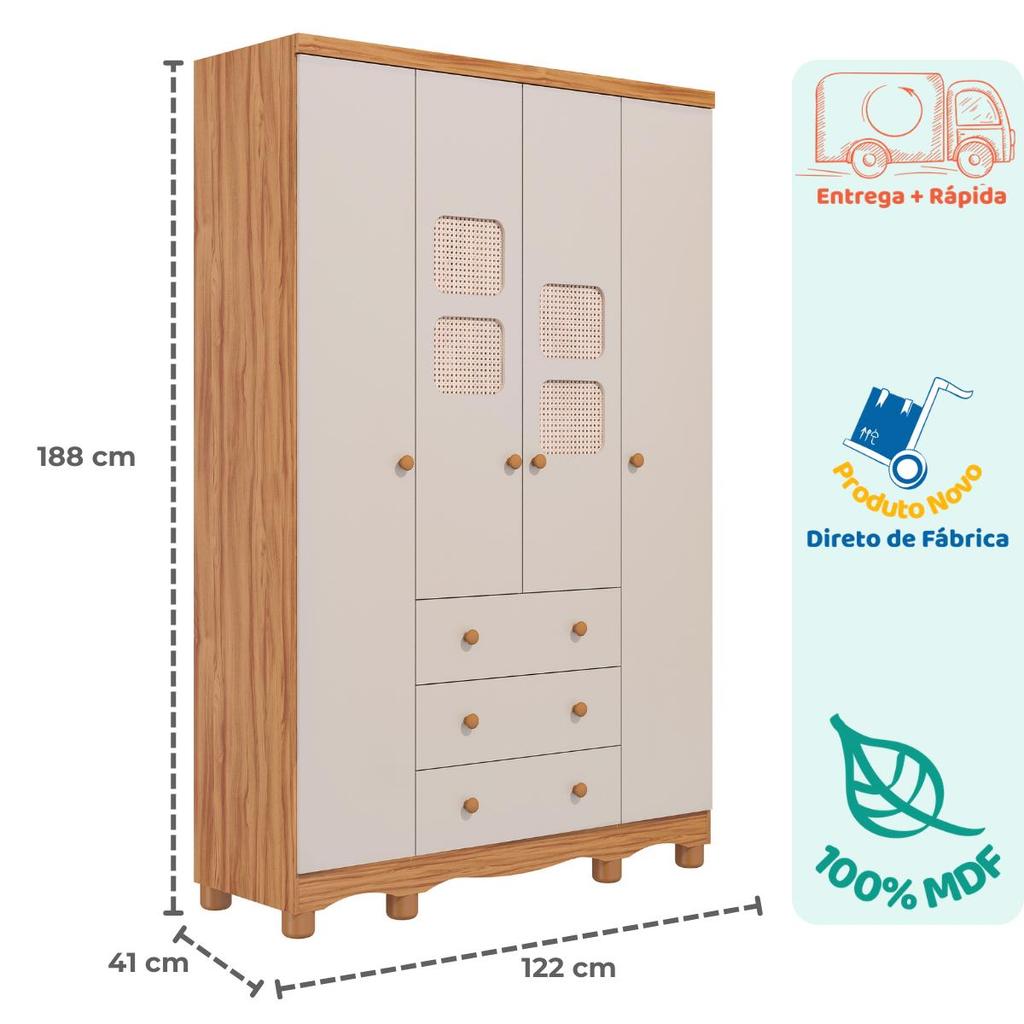 Guarda Roupa Infantil Telinha Off White 4 Portas 3 Gavetas 100% MDF