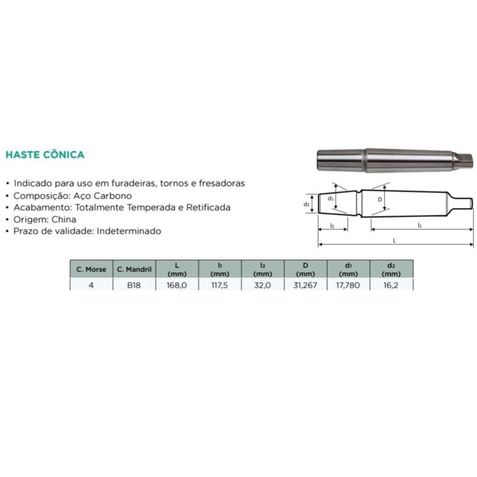 HASTE PARA MANDRIL CM4XB18 - ENCAIXE CONE MORSE 4 X B18