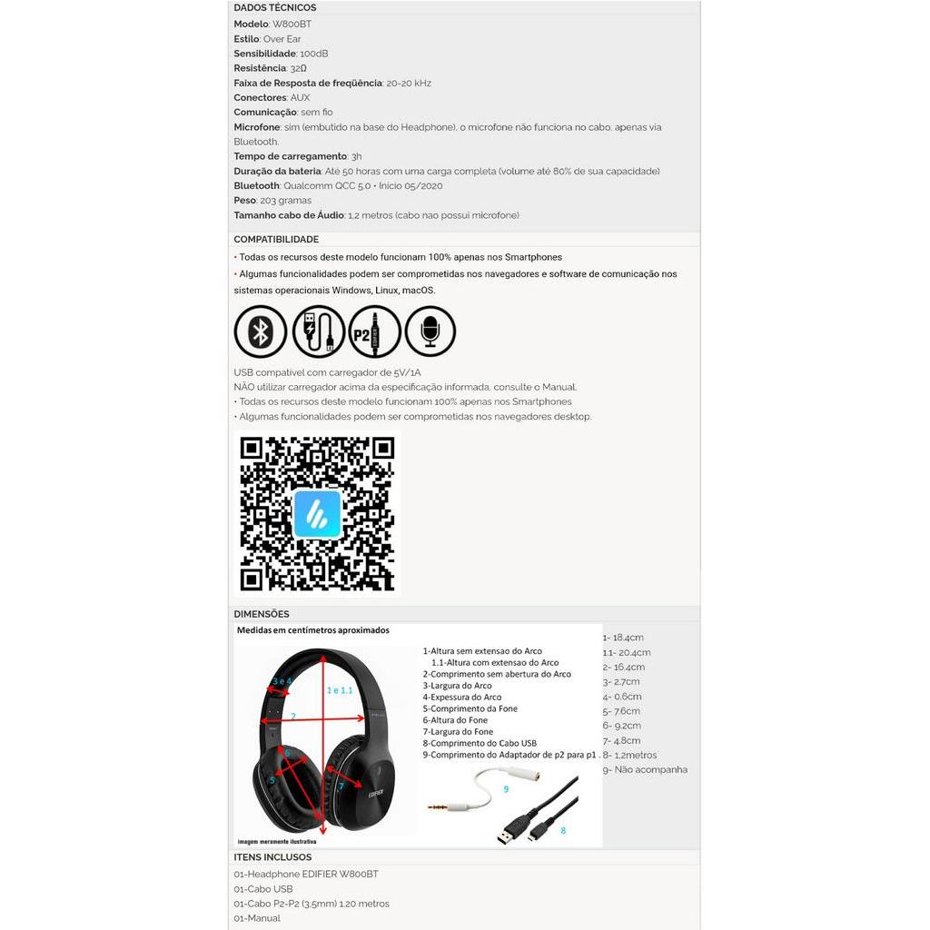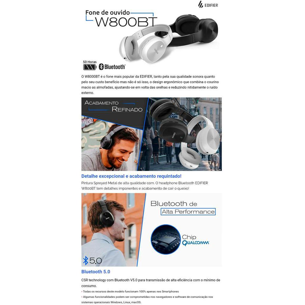 Headphone Bluetooth Fone De Ouvido Sem Fio Edifier W800bt Preto 5.0 - Preto