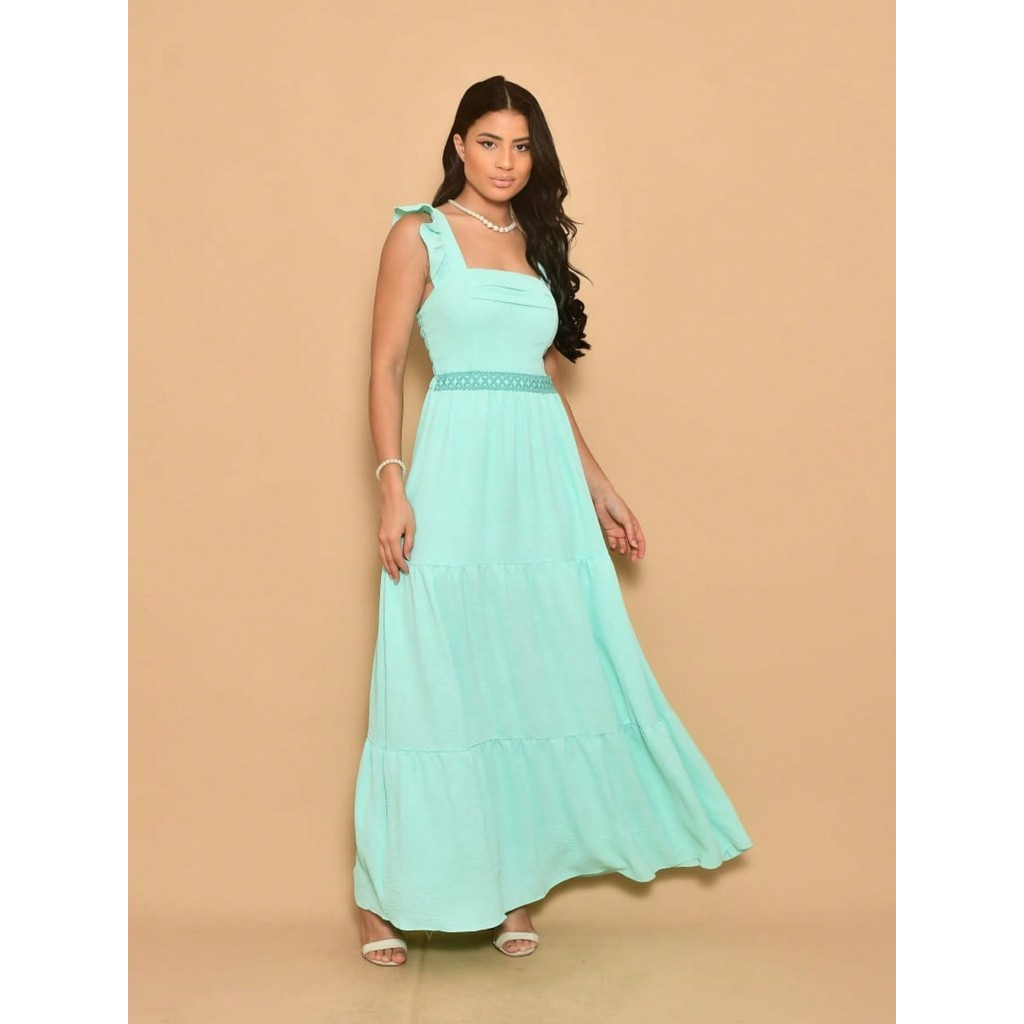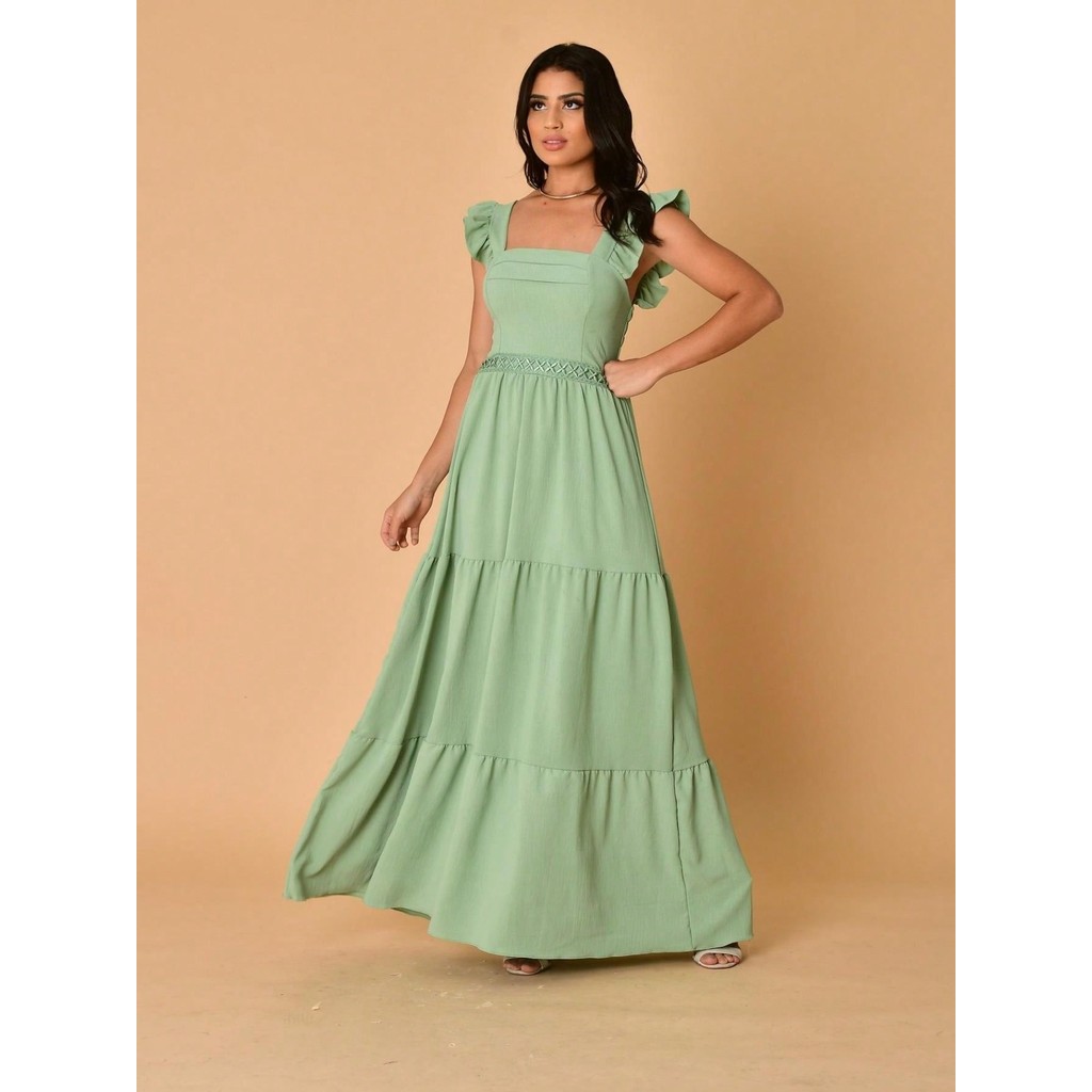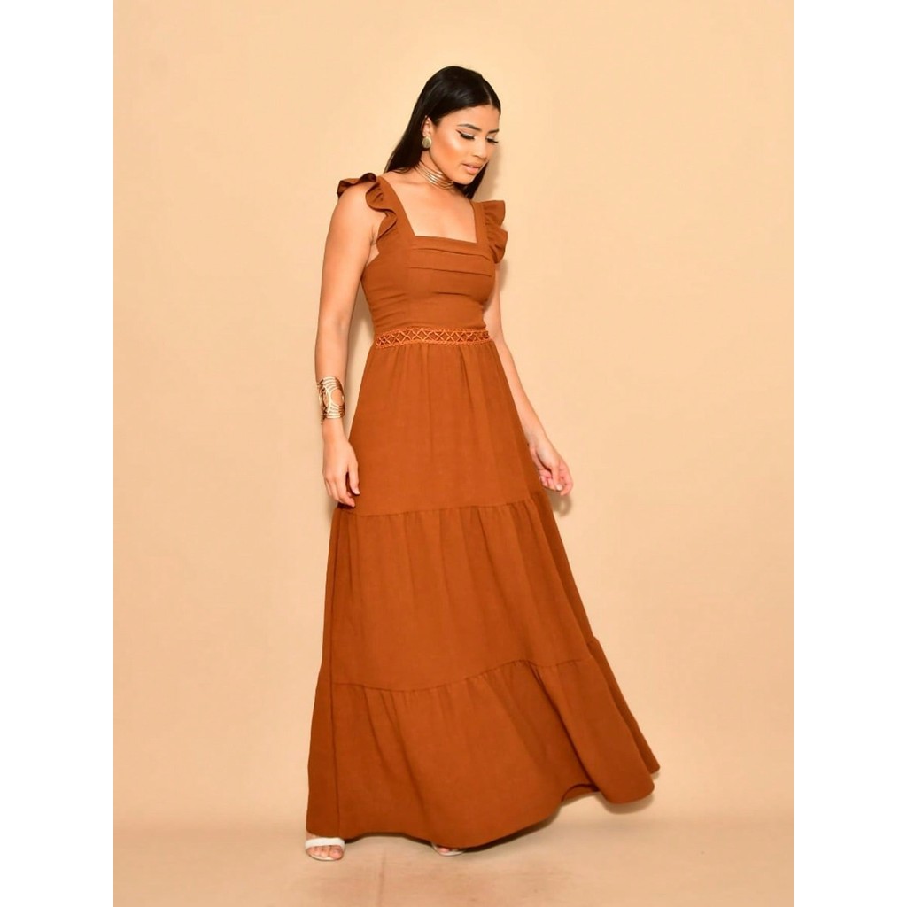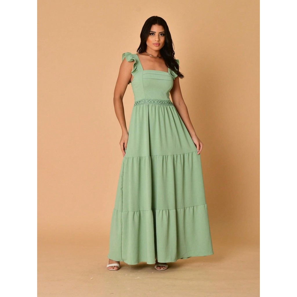 Helena Vestido longo luxo duna lisa com babada na manga renda na cintura