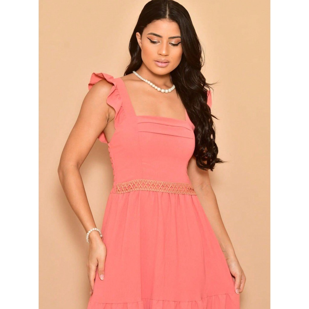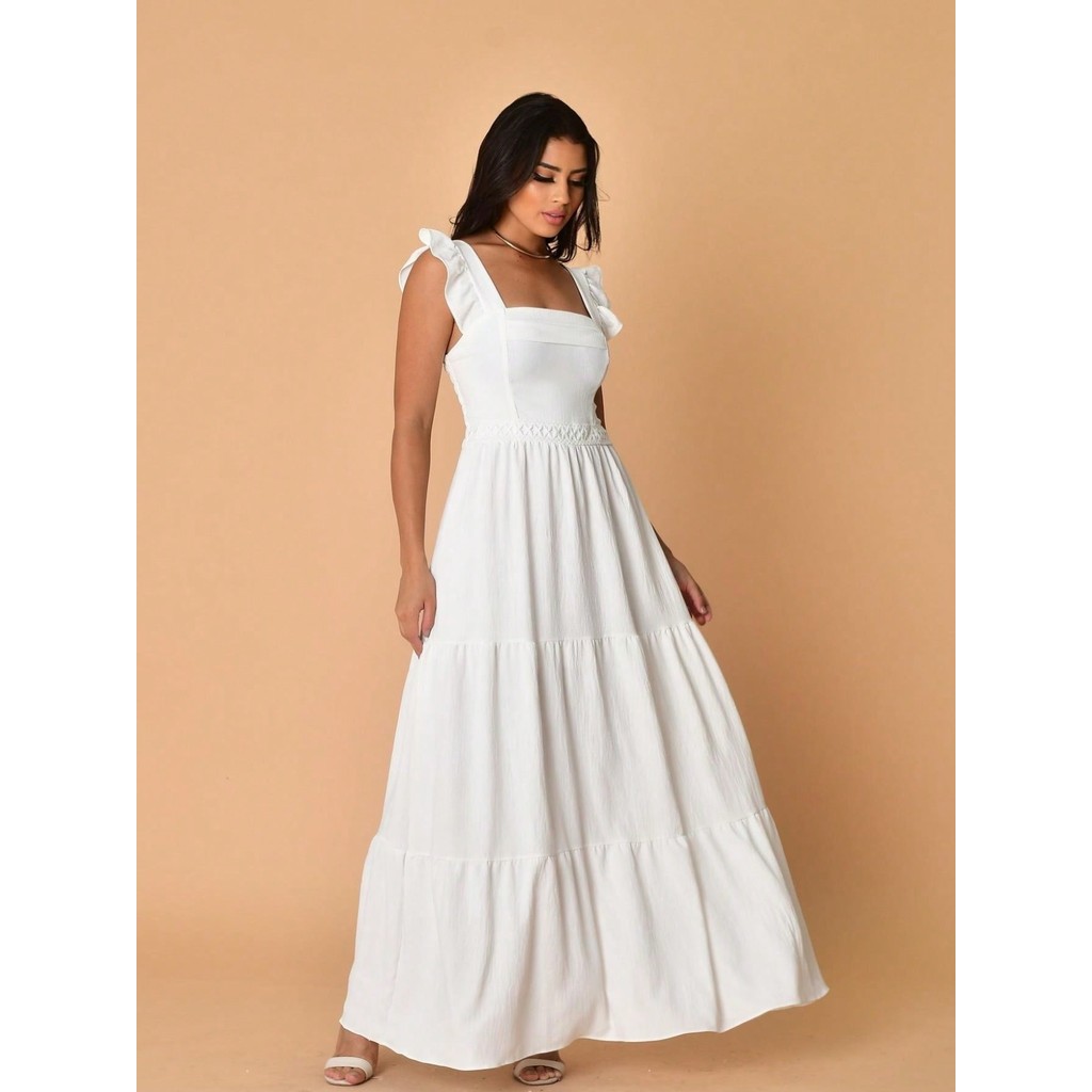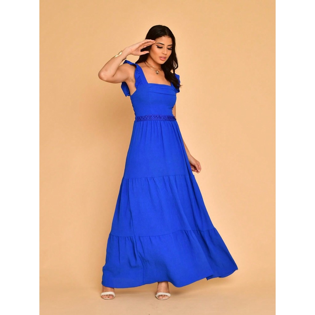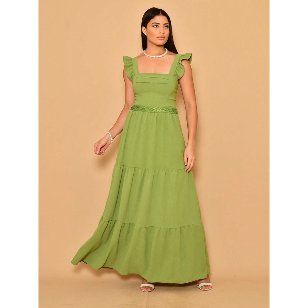 Helena Vestido longo luxo duna lisa com babada na manga renda na cintura