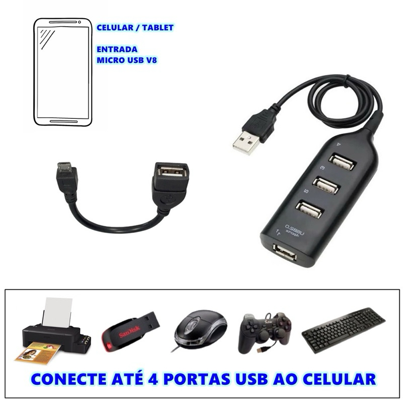 Hub 4 Portas Usb Com Fio De 1 Metro Mobilador + Otg Micro Usb V8 Mobilador Celular Teclado Mouse Pen Drive