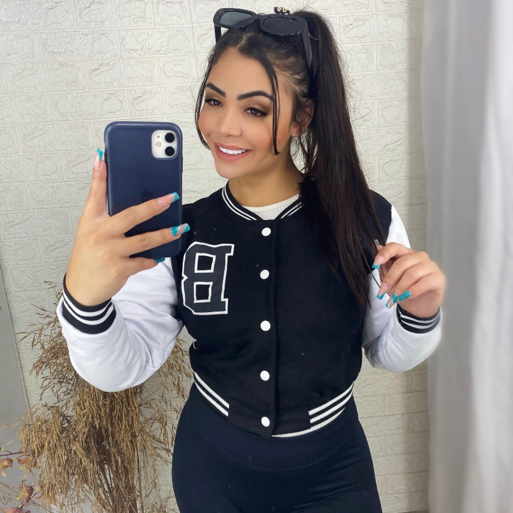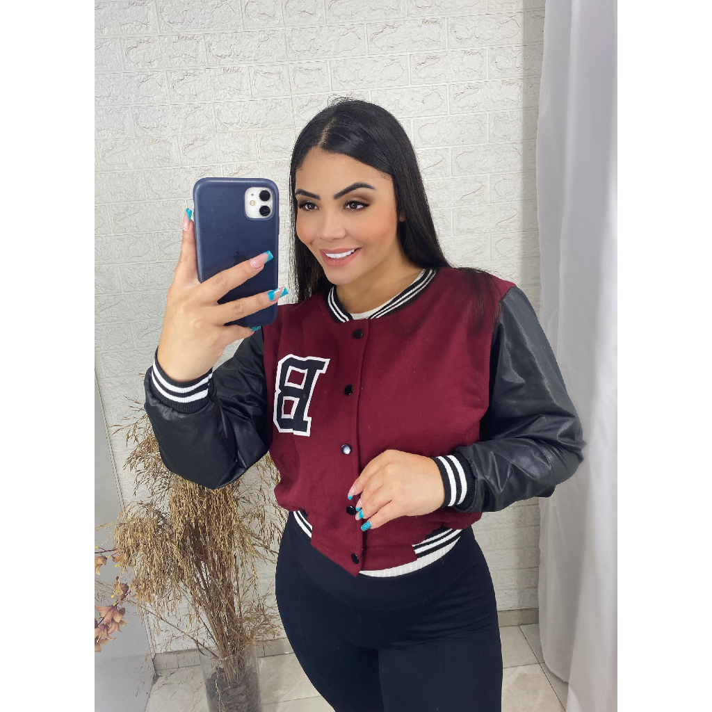 Jaqueta Bomber Moletom Feminina Manga Couro fake preta