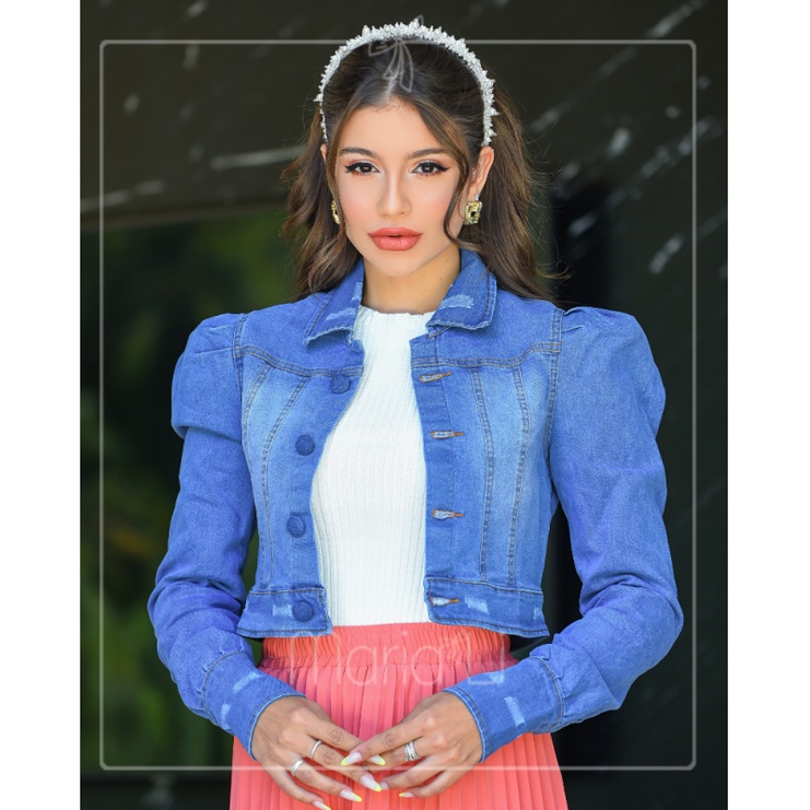 Jaqueta Jeans Feminina Curta com Manga Princesa Moderna Elegante Corte Perfeito